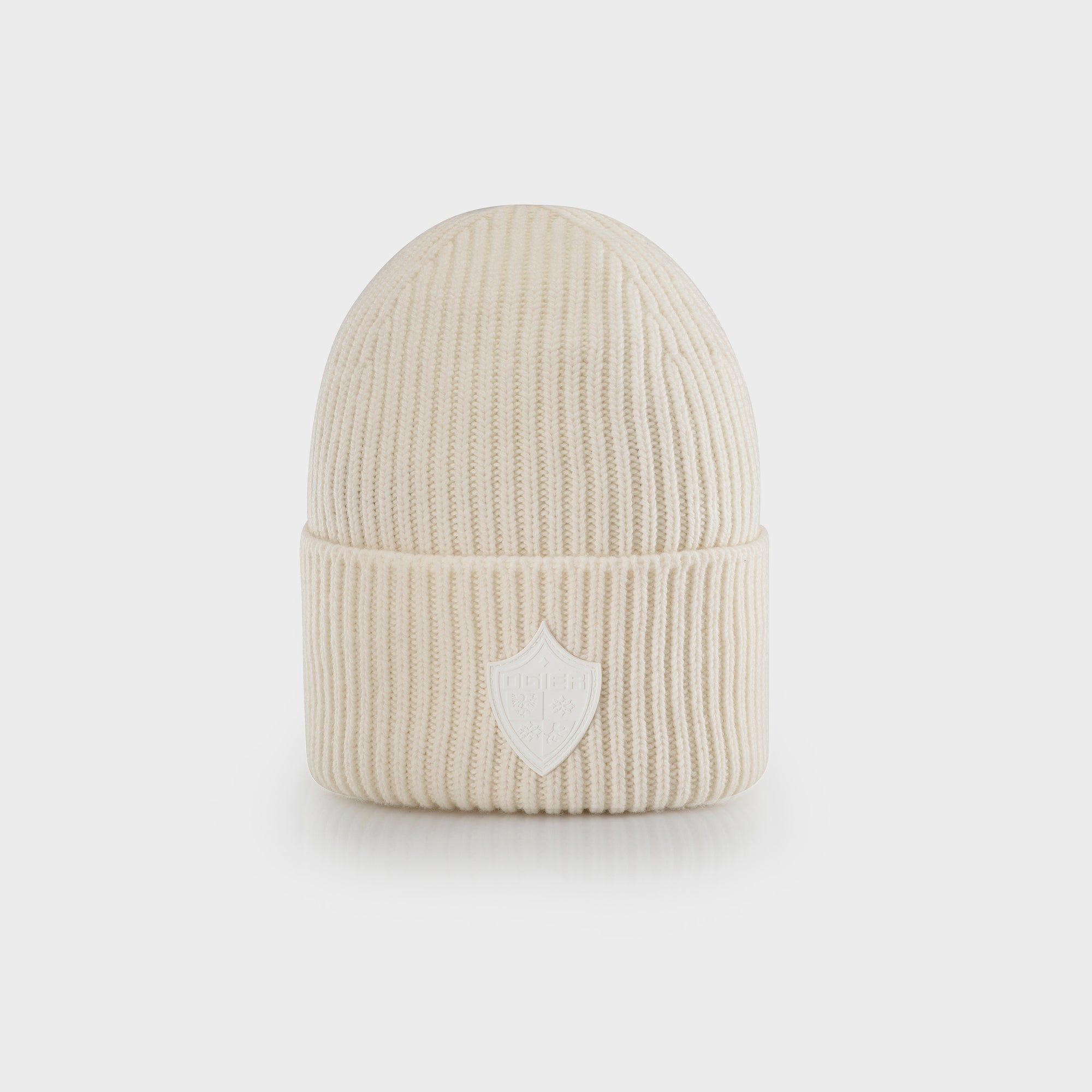 The ribbed knit hat showcases a timeless design, enhanced by an intricately crafted seal emblem from the House of Ogier, adding a touch of distinction. Made from pure cashmere, this luxurious accessory is available in a palette of classic colors, ensuring versatile elegance for any wardrobe.