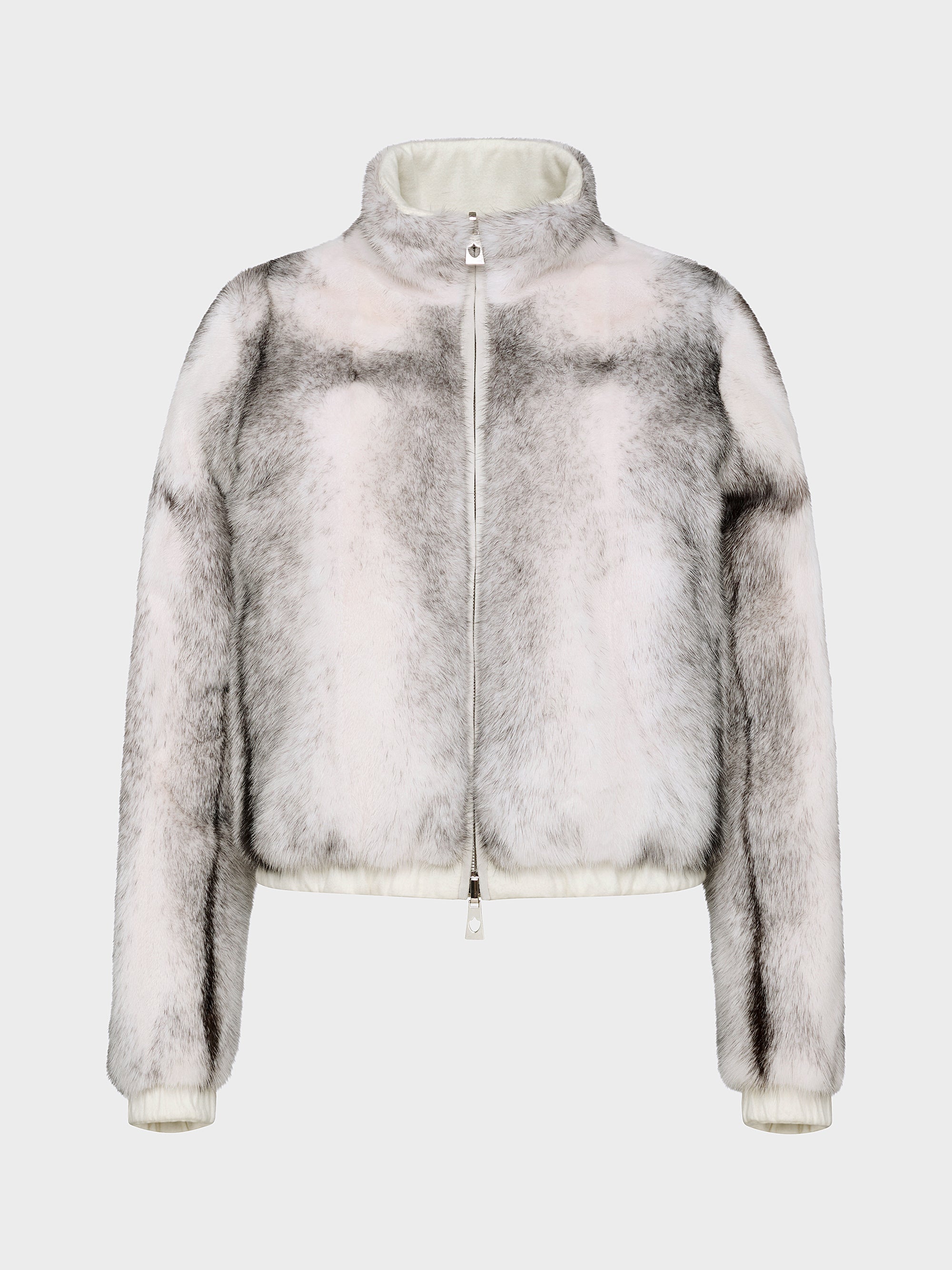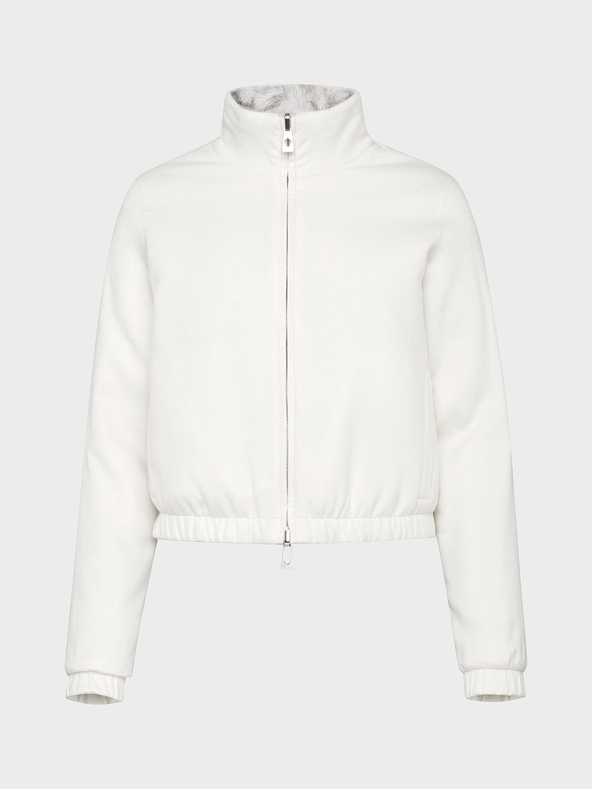 This reversible bomber jacket is elevated with a luxurious touch for cozy seasonal style. Designed in a relaxed, casual silhouette, it combines the plush softness of baby cashmere with velvety mink in a striking natural cross-mink pattern. Adjustable hem and a metal zipper add a sporty, functional edge. Pair effortlessly with the Suvretta cashmere pants from the same collection and Valencia winter sneakers featuring a full mink lining.