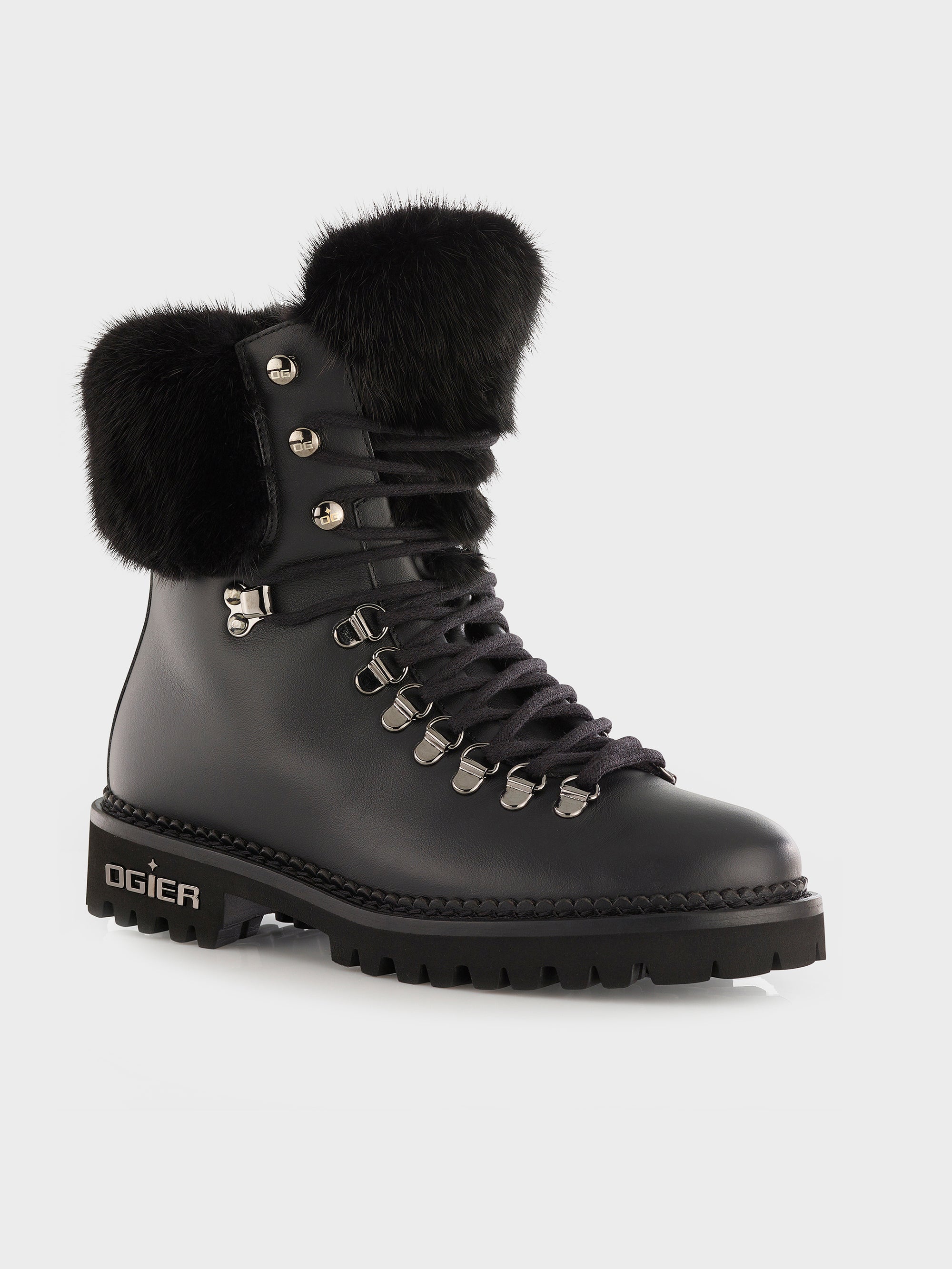 Ideal après-ski footwear crafted from superior quality french calfskin leather. Protective, comfortable, light, offering the best sensations of holding, fluidity and grip in alpine territory. Highly resistant and comfortable sole that mimic the look and mechanics of being barefoot. Mink fur in and out. Zipper on the side.