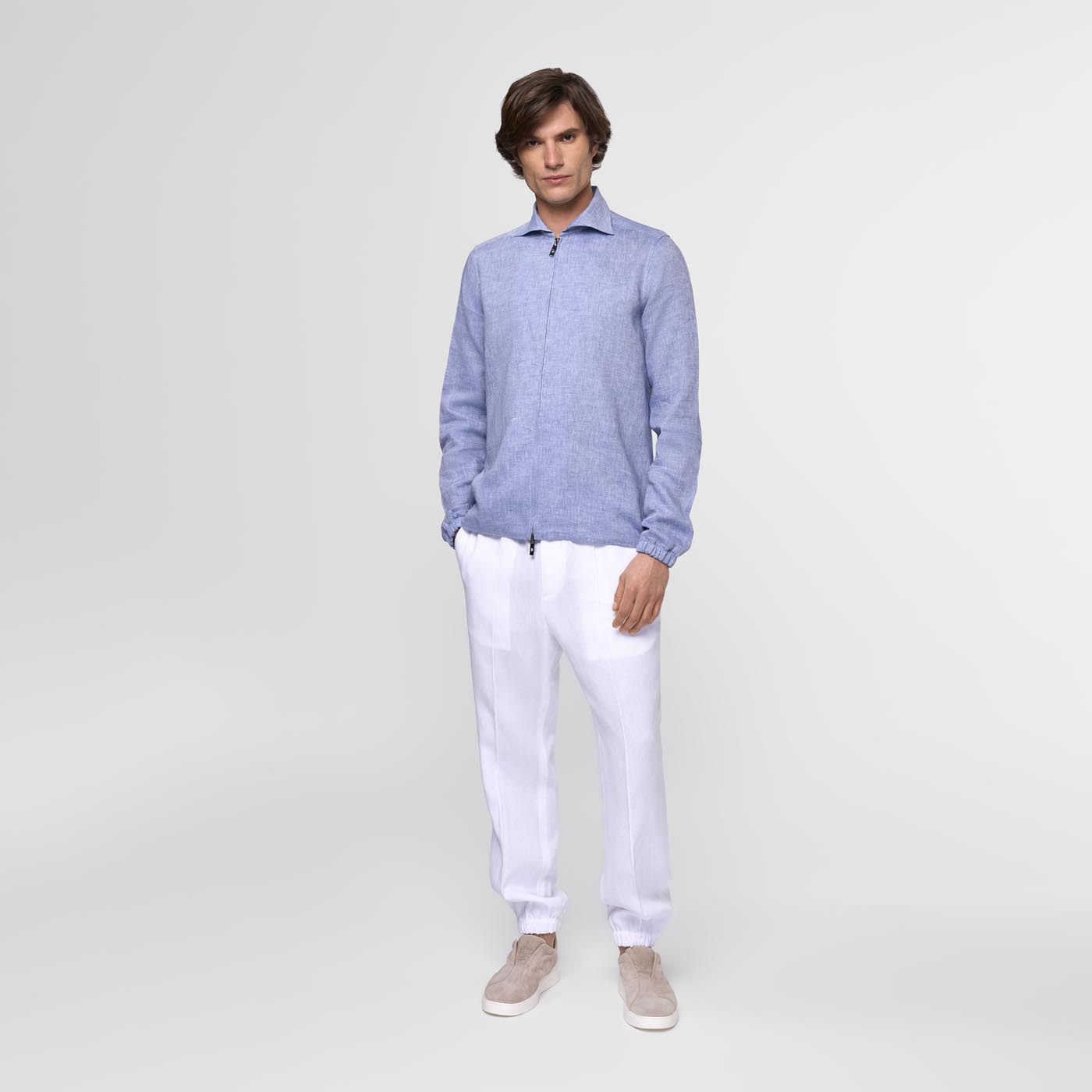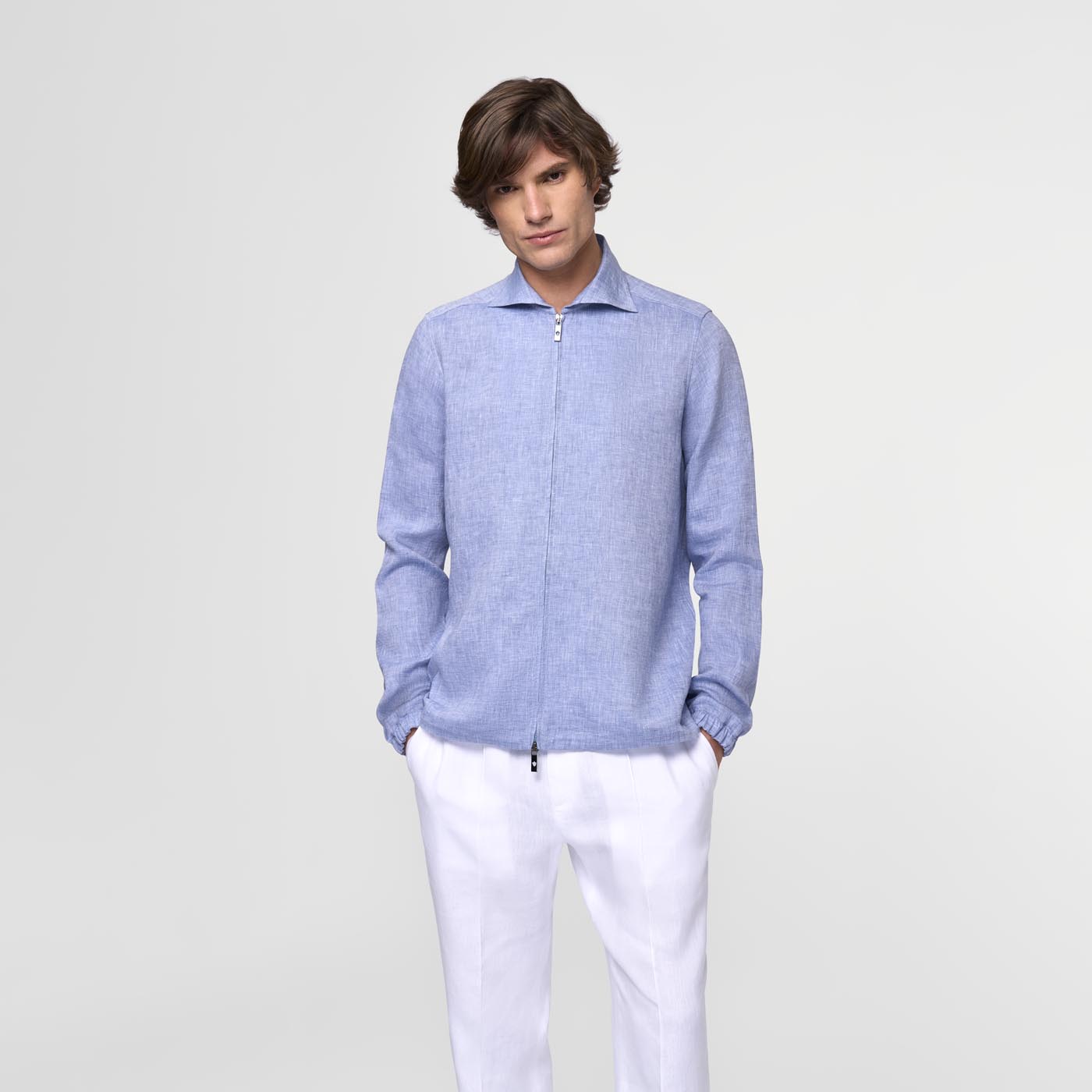 Crafted from high-quality Japanese linen, this shirt blends natural elegance with everyday comfort. The front zip adds a modern touch and makes it easy to slip on and off. With an adjustable elastic hem, the fit can be adapted for a relaxed or elegant silhouette. A versatile piece designed for those who value style, ease, and functionality.