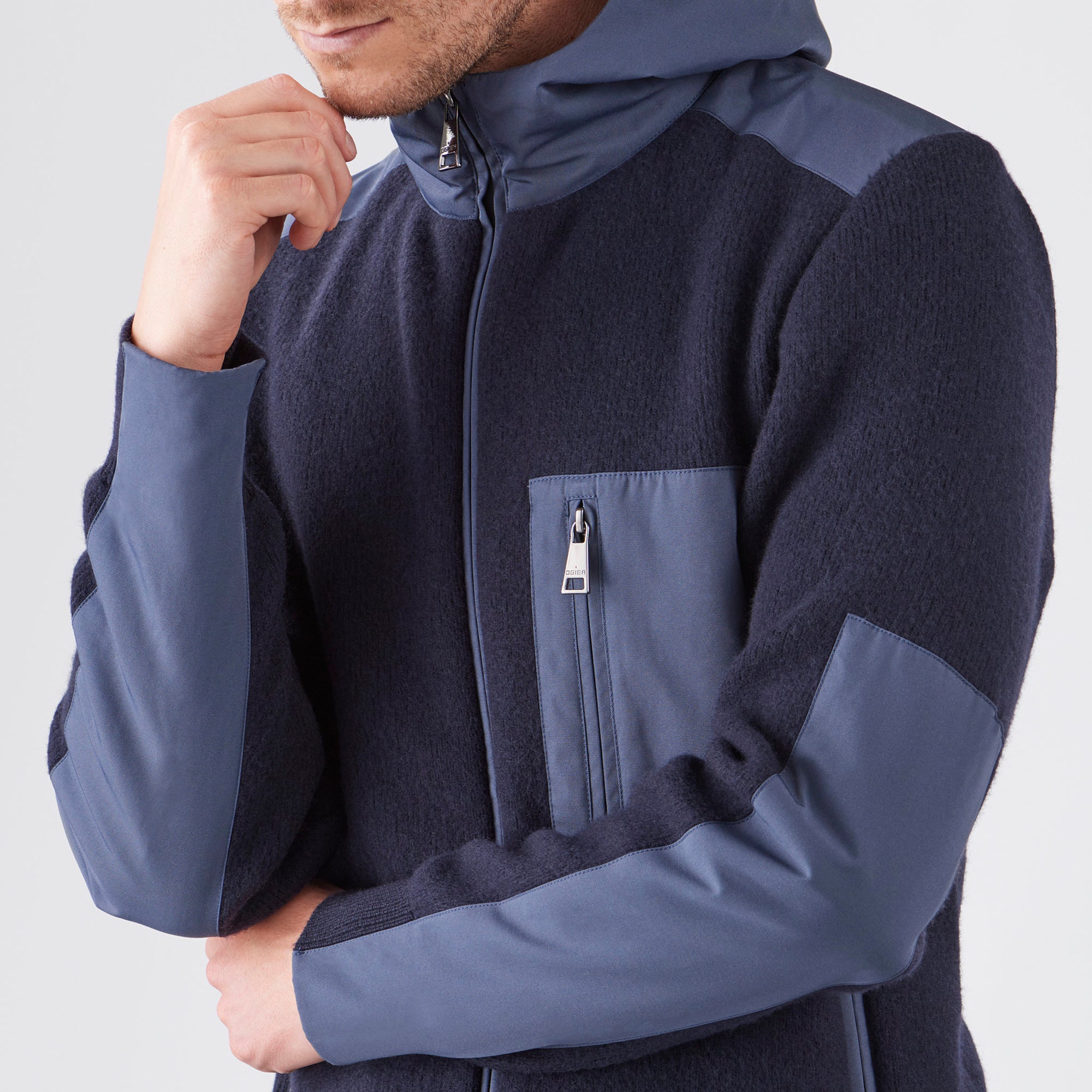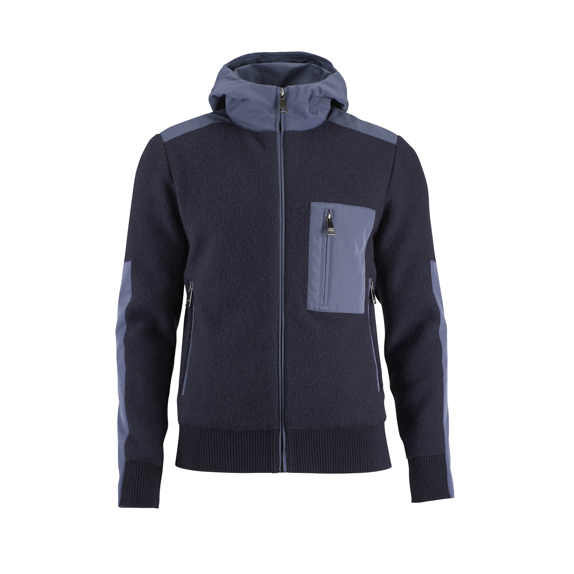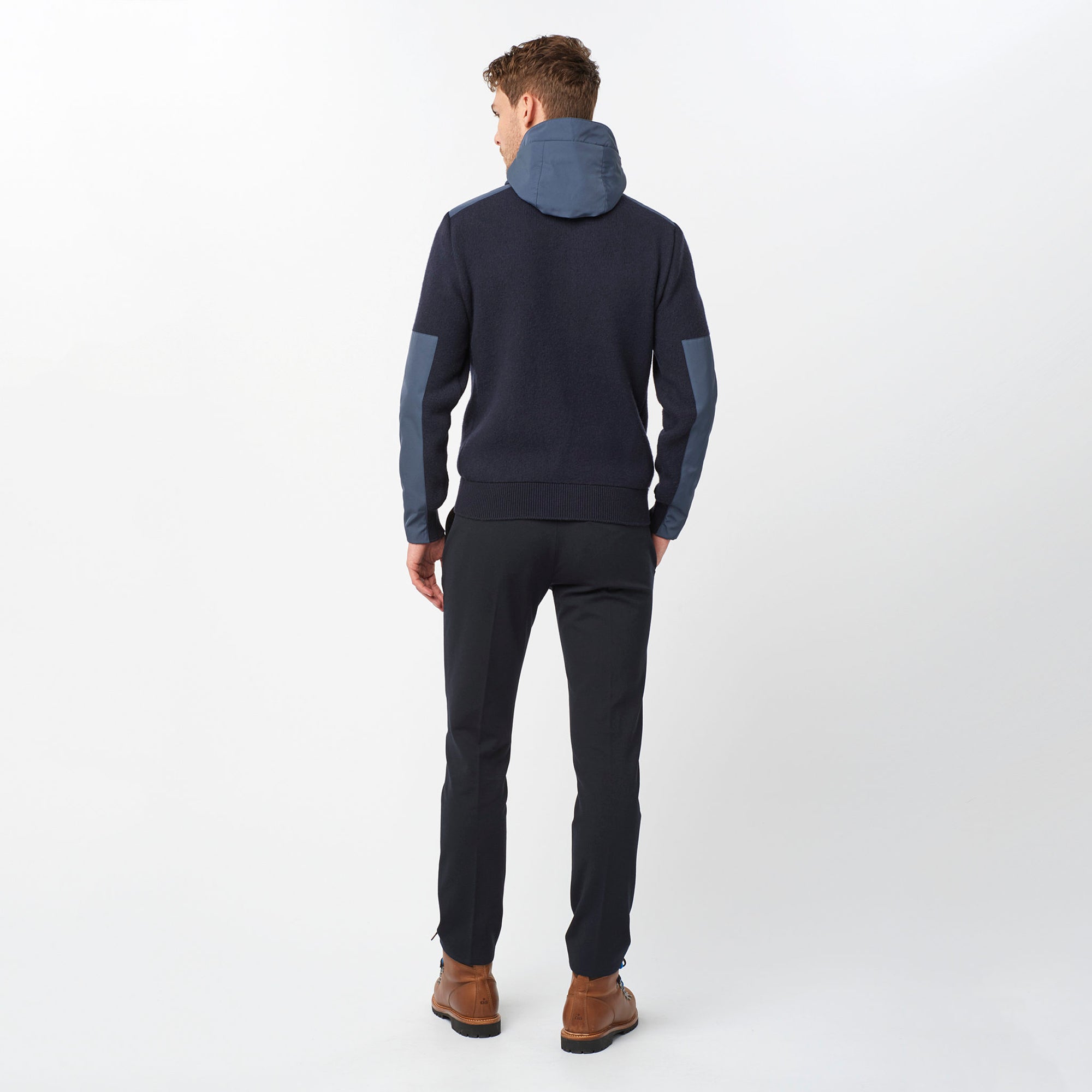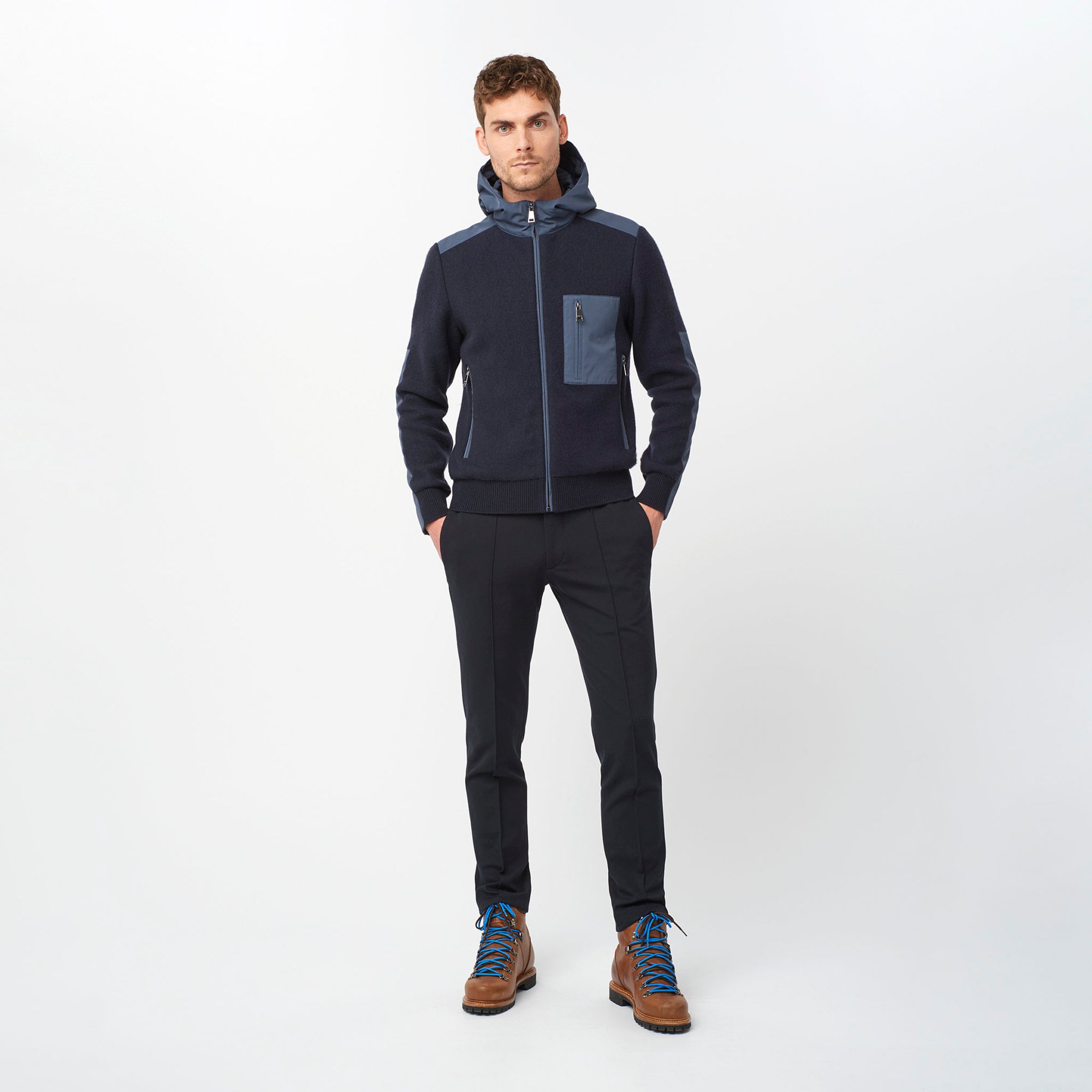 Zip front cardigan created in a wool and elastin stretch material featuring nylon detailing. As shown with Masaccio Pants and Kansas Boots.