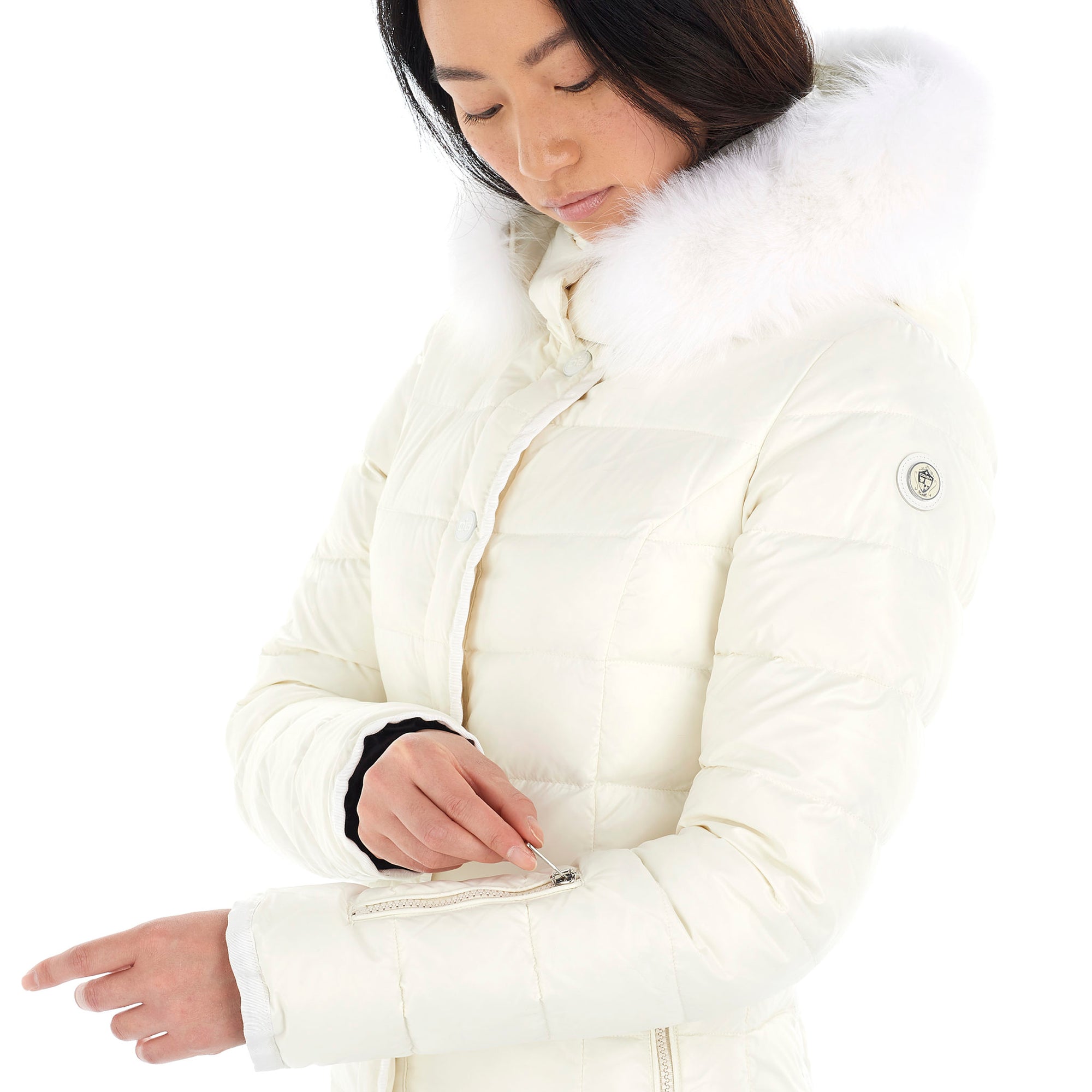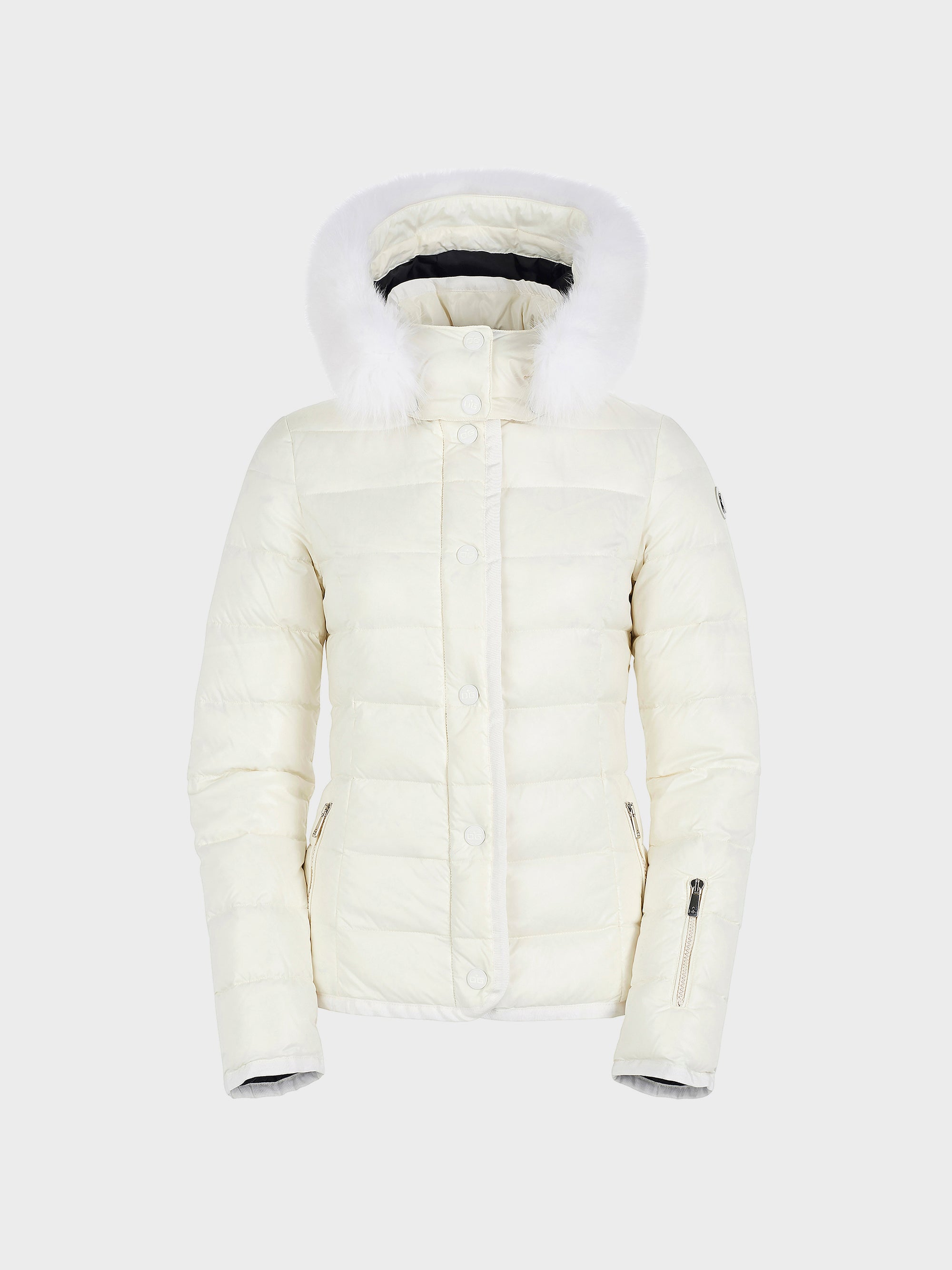 Short down jacket suitable for skiing and city wear. Fur and hood removable separately.