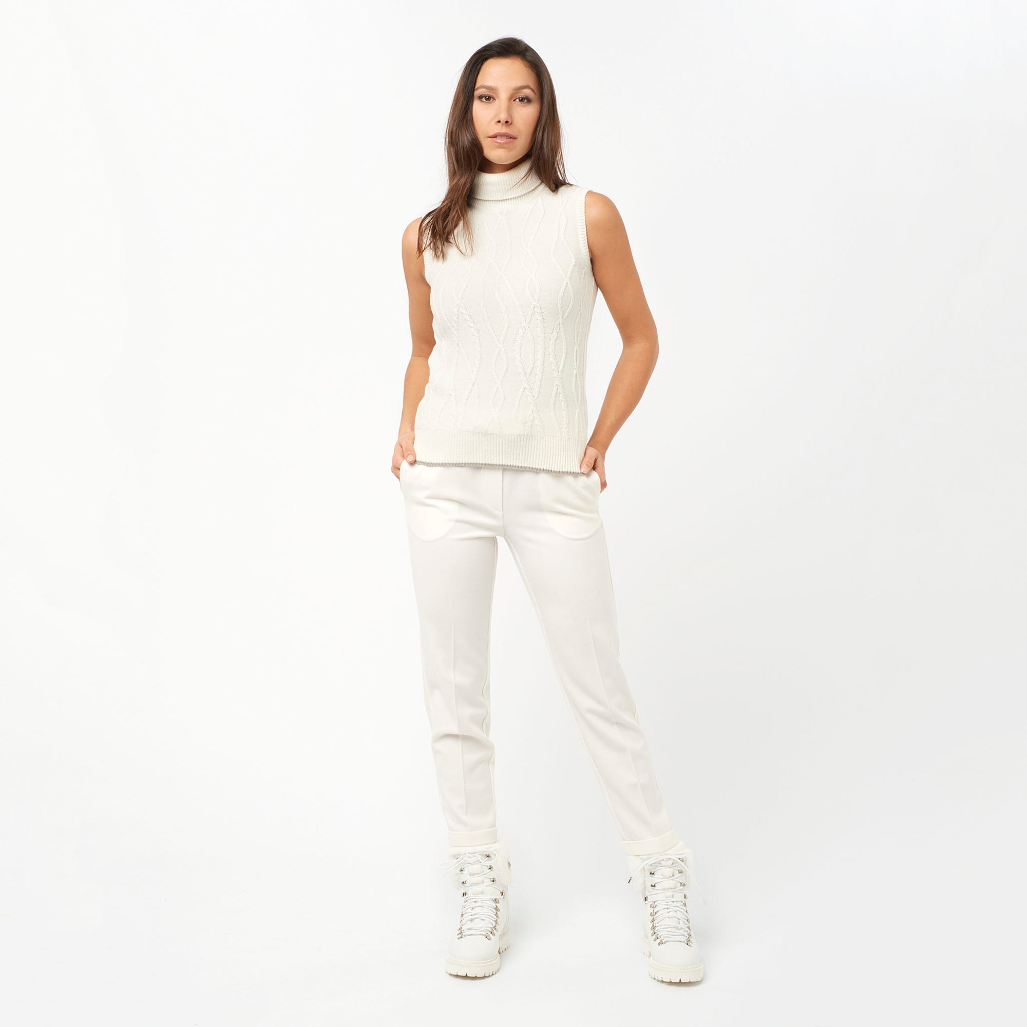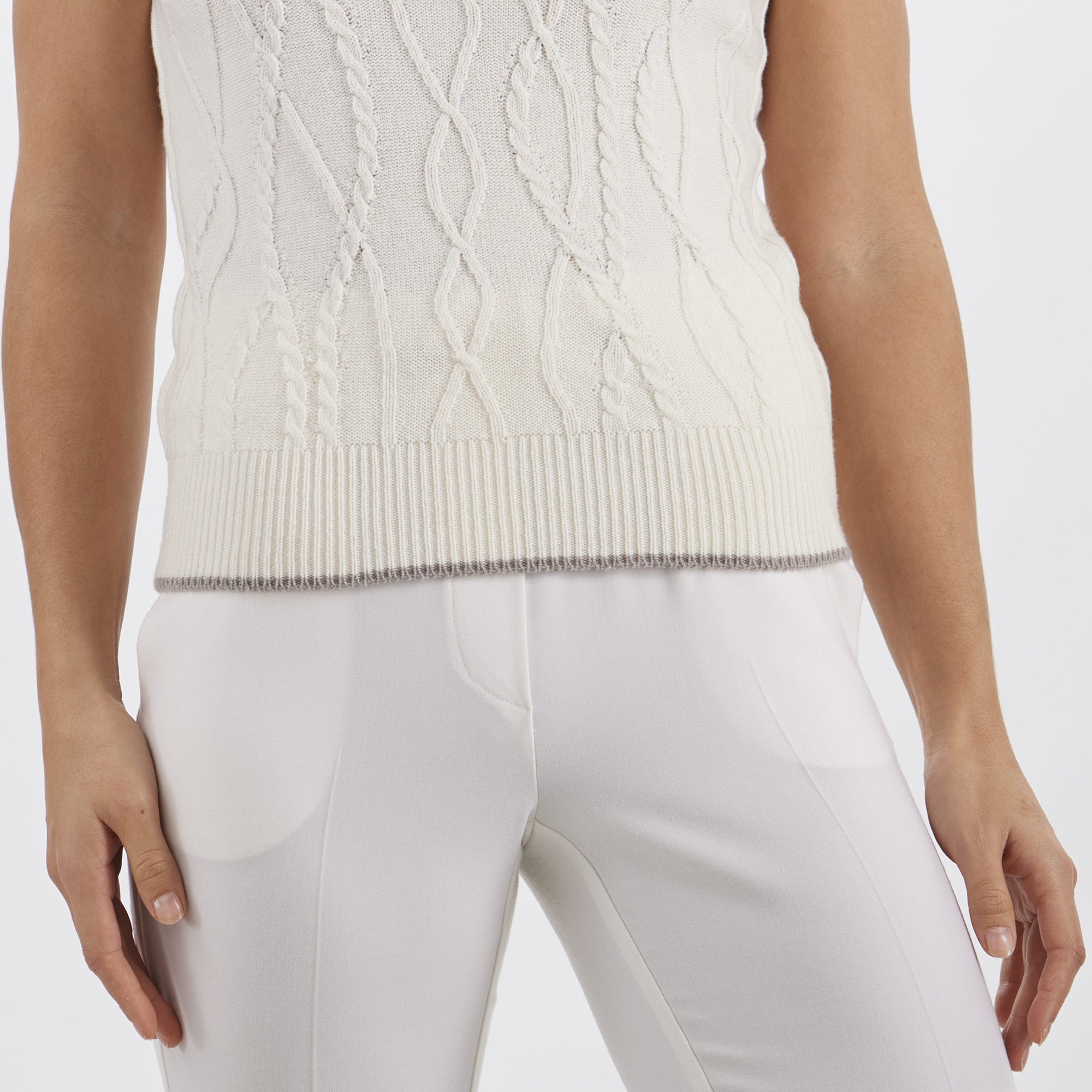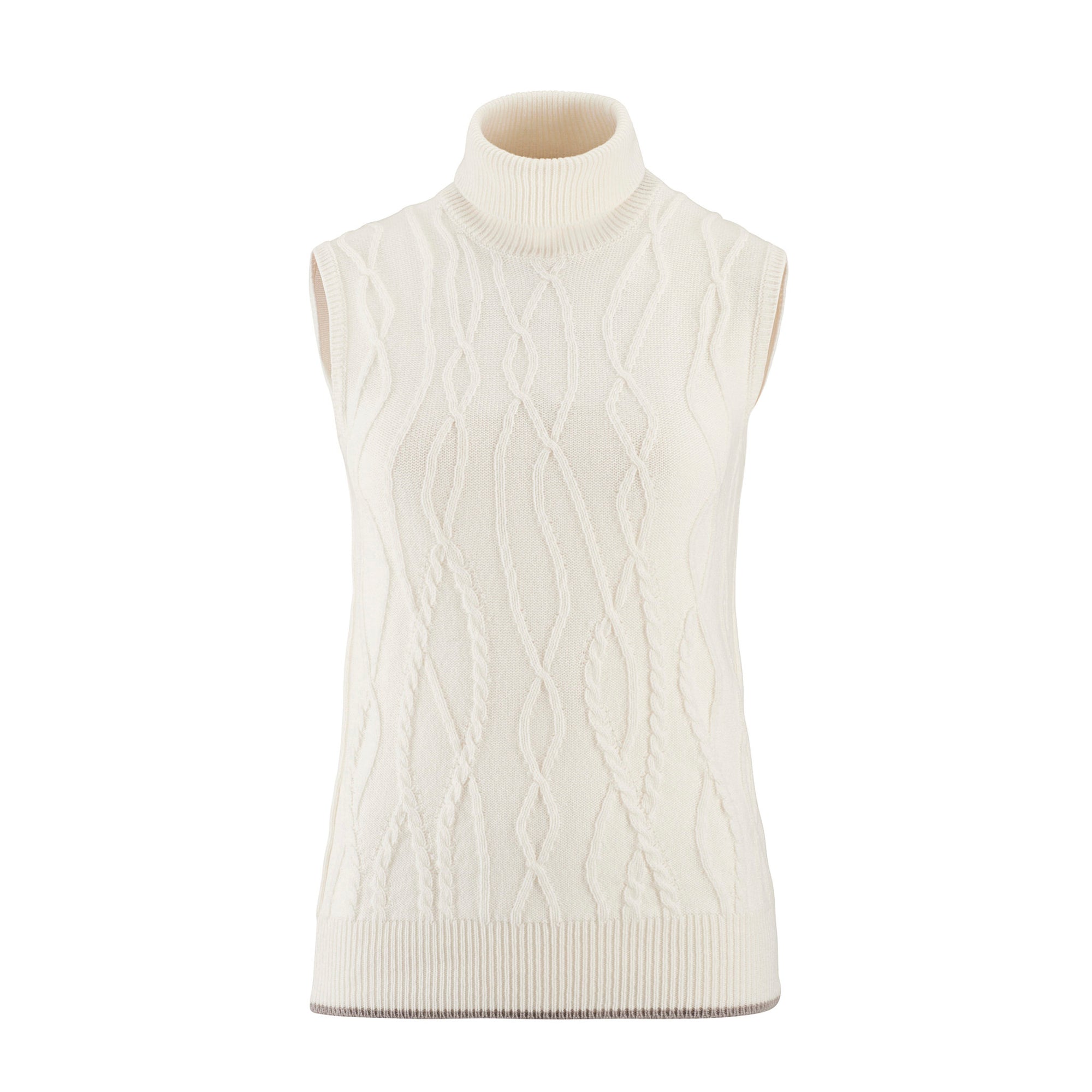 Classic cable knit sleveless turtleneck in a contemporary fitted silhouette. As shown with the Michigan pant. Also available in grey.