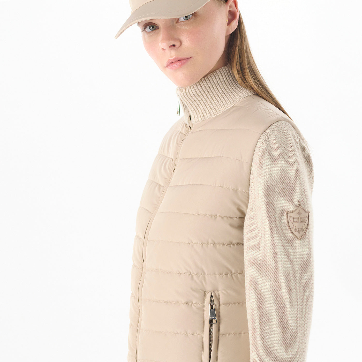 Our "Luzern" model cardigan combines the warmth of a puffer with the wearability of a knit. This merino wool and nylon cardigan is a perfect day-to-night piece and features multiple pockets and a zip up design and is stuffed with Italian goose down. As shown with the coordinating "Luzern" model tee and knit pants, Davos beige bottine.