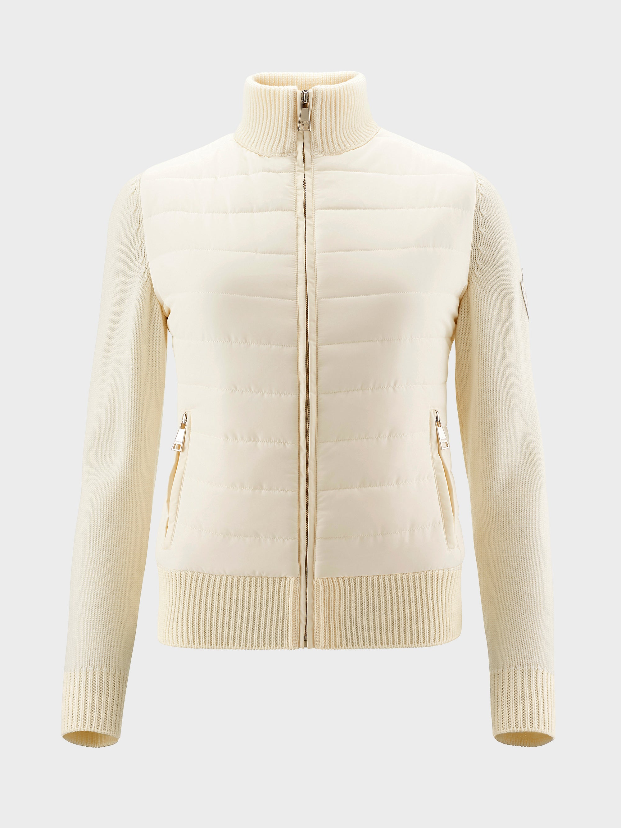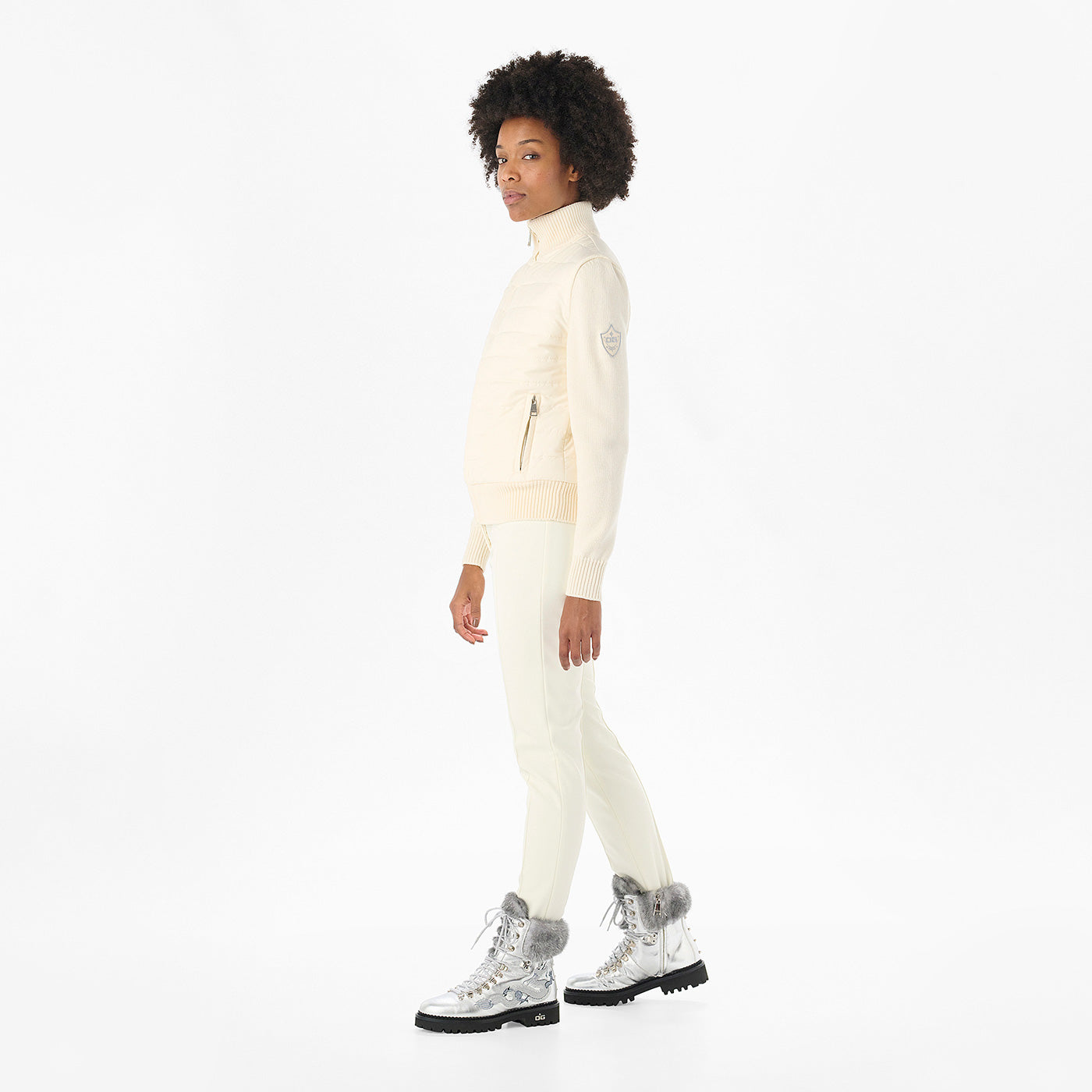 Our "Luzern" model cardigan combines the warmth of a puffer with the wearability of a knit. This merino wool and nylon cardigan is a perfect day-to-night piece and features multiple pockets and a zip up design and is stuffed with italian goose down. As shown with the Kelly after ski pant and Fussen Drogon snow boots.