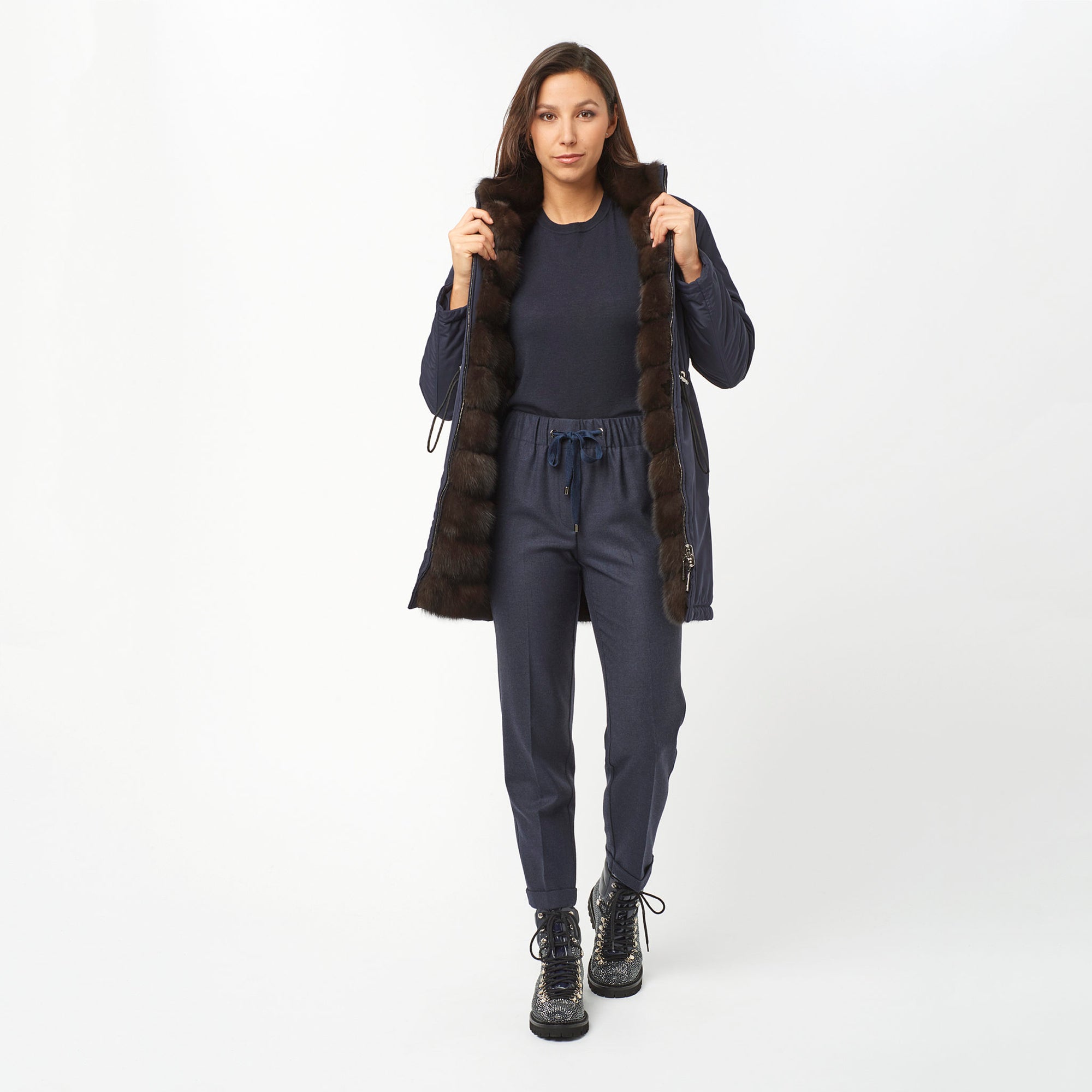 Conical leg silhouette created with a covered elastic waistband and featuring pockets, front zip clousre and drawstring design
