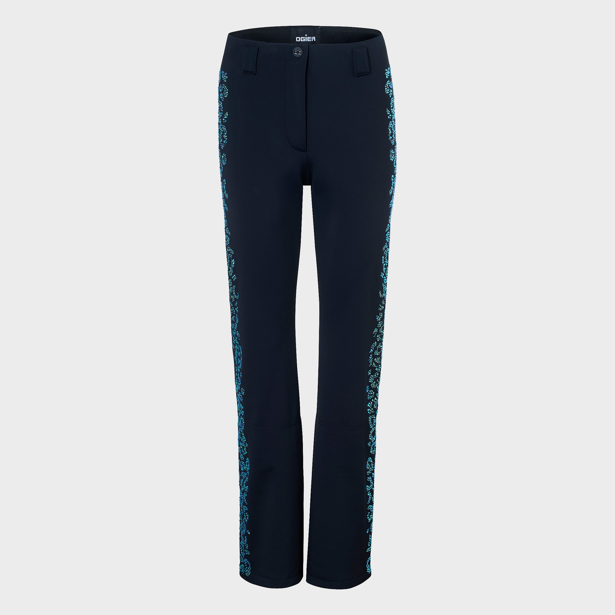 Our classic "Lady Swarovski" stretch ski pant silhouette with a newly panthere collection design. Constructed with a water resistant yet completely breathable fleece lined material. Featuring chameleon Swarovski detail. Model wears S.
