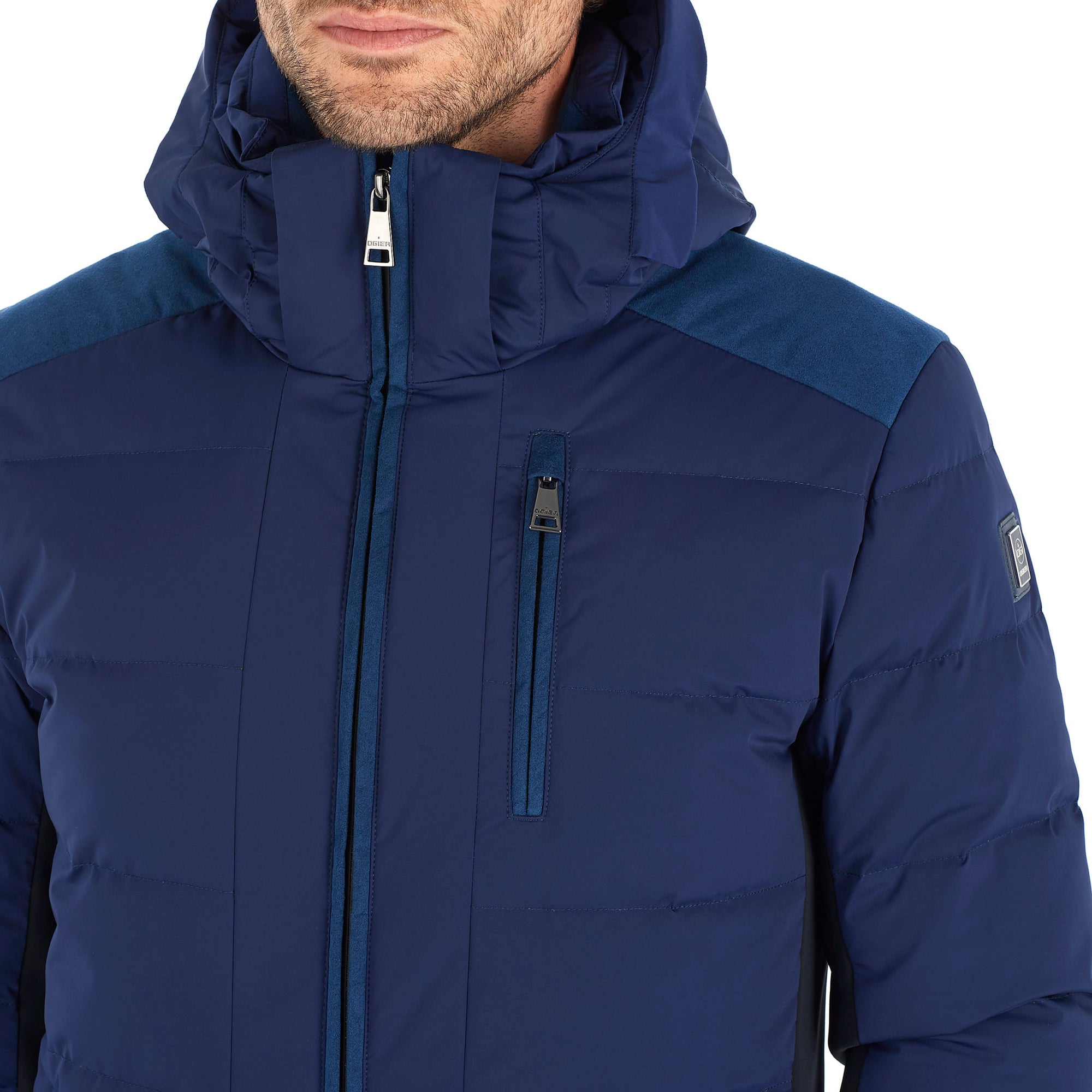 Fitted down jacket suitable for skiing and sightseeing. Silky fabric treated for a waterproof, wind-resistant finish. Fully lined interior in Alcantara as well as shoulders and zippers.