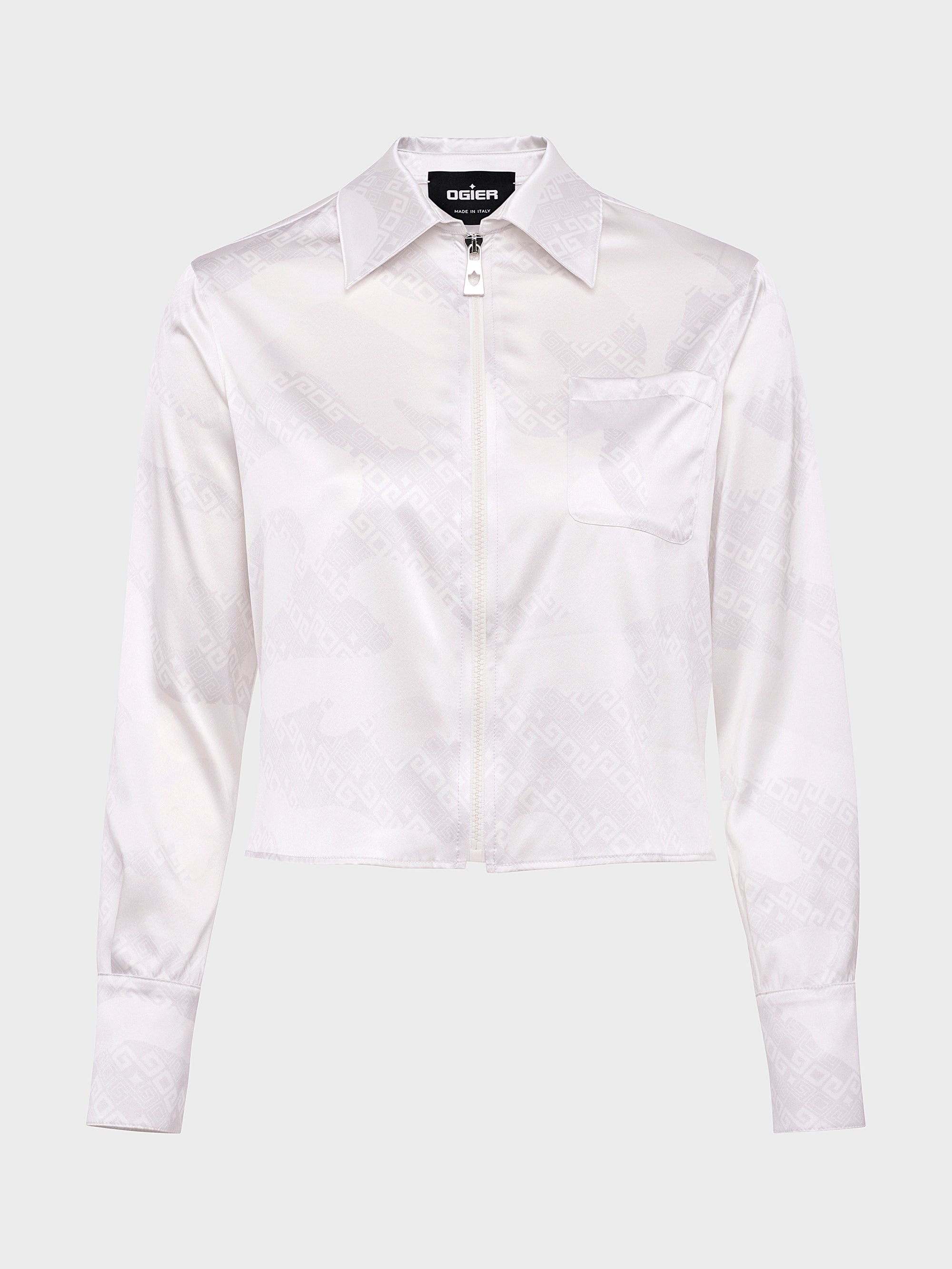 A modern take on casual tailoring, this short-sleeved shirt is crafted from airy printed silk in tonal shades of white and grey. The front zip closure adds a sporty edge, while the smooth, breathable fabric ensures all-day comfort. Delicately incorporating the brand’s signature into the design, it pairs effortlessly with the matching silk shorts for a coordinated look that’s both relaxed and refined.