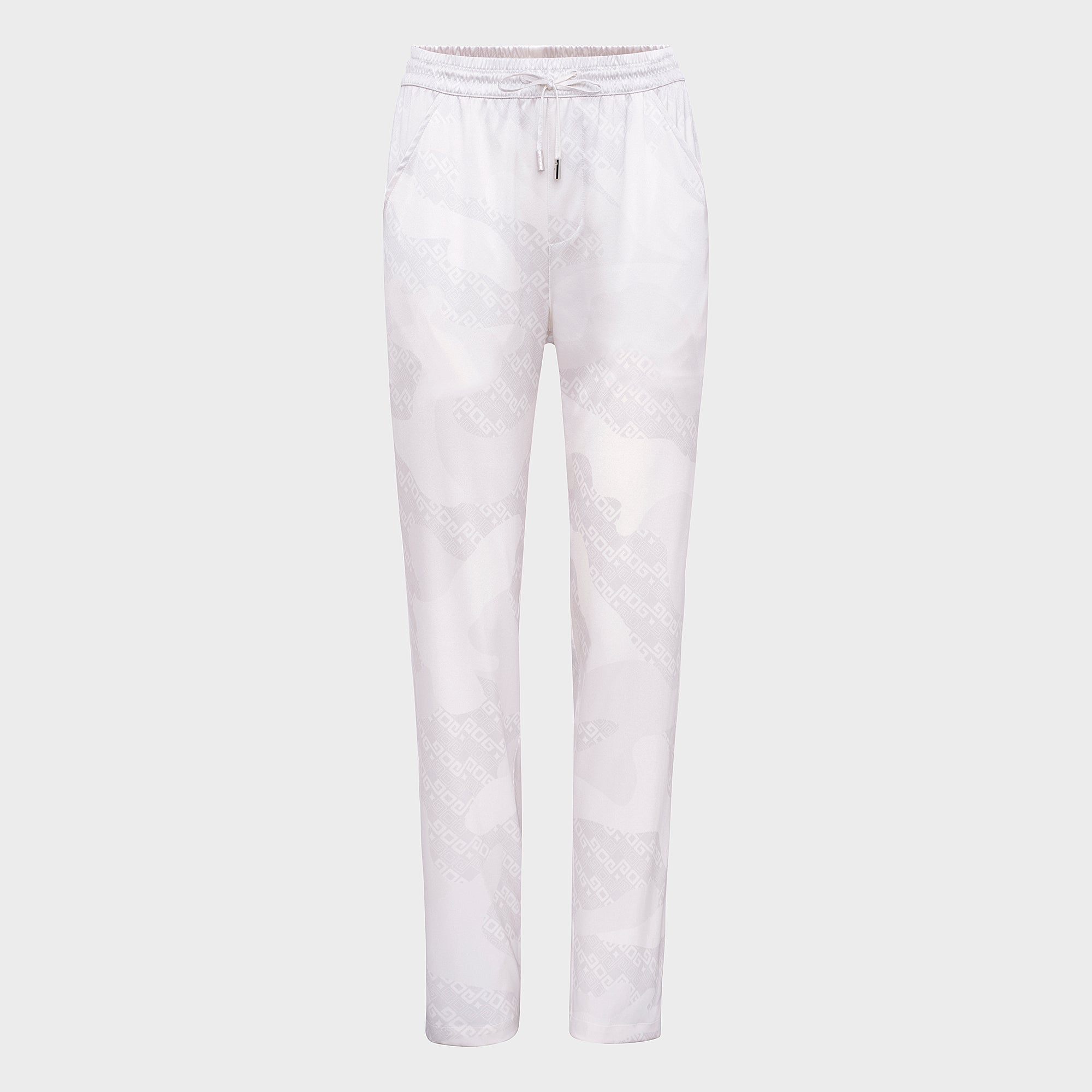 Blending laid-back elegance with exceptional comfort, these printed silk joggers feature soft tones of white and muted grey. The lightweight, airy silk drapes beautifully, offering a fluid feel against the skin. Subtly incorporating the brand’s signature within the print, this piece adds a refined touch of identity. Perfect for lounging in style or stepping out with effortless sophistication.