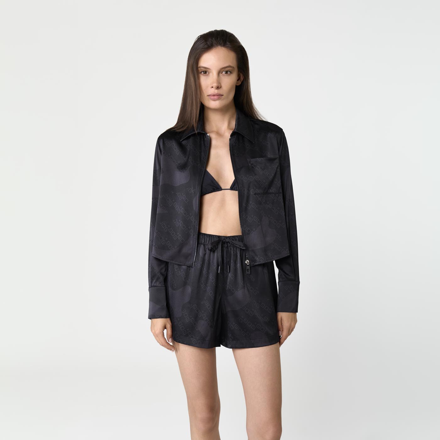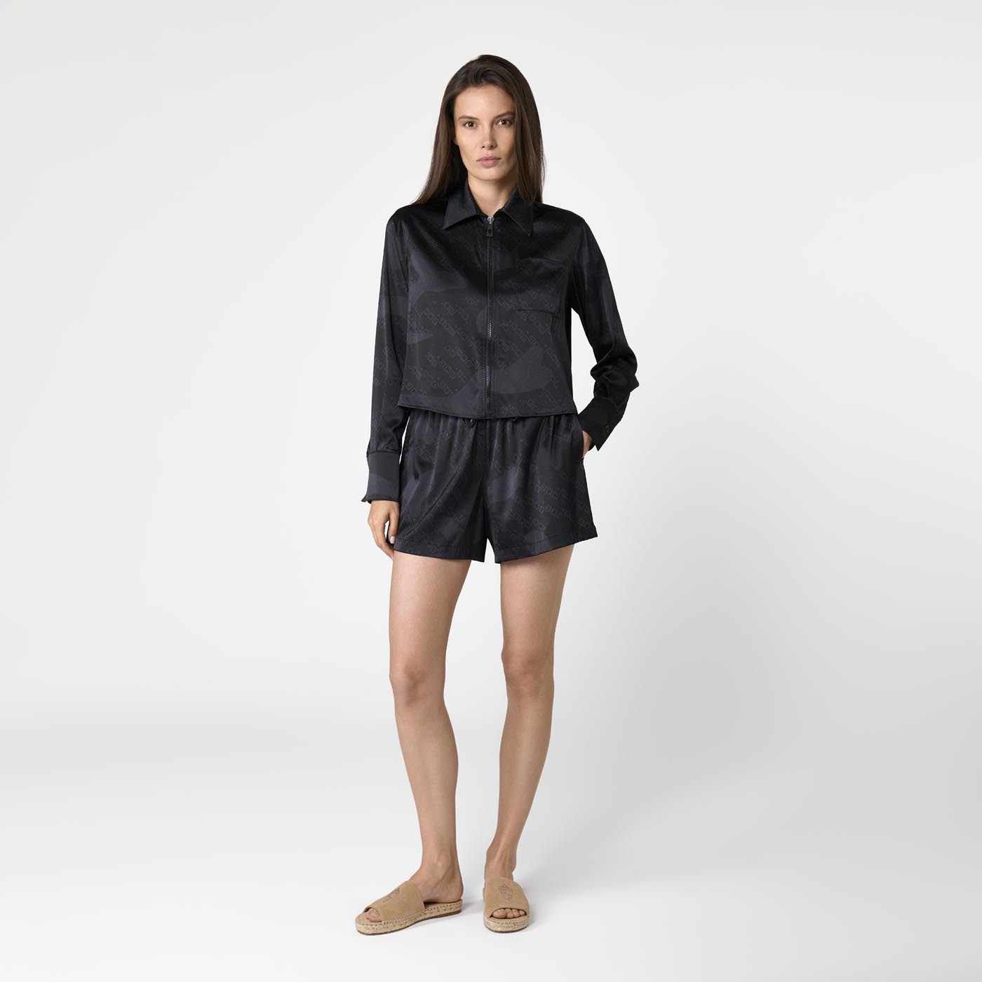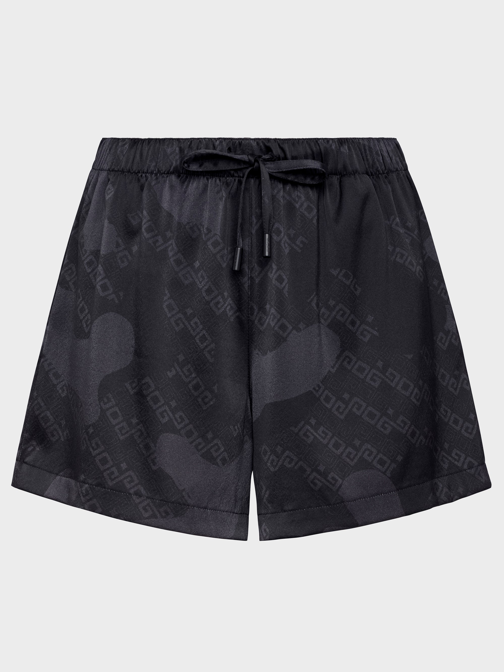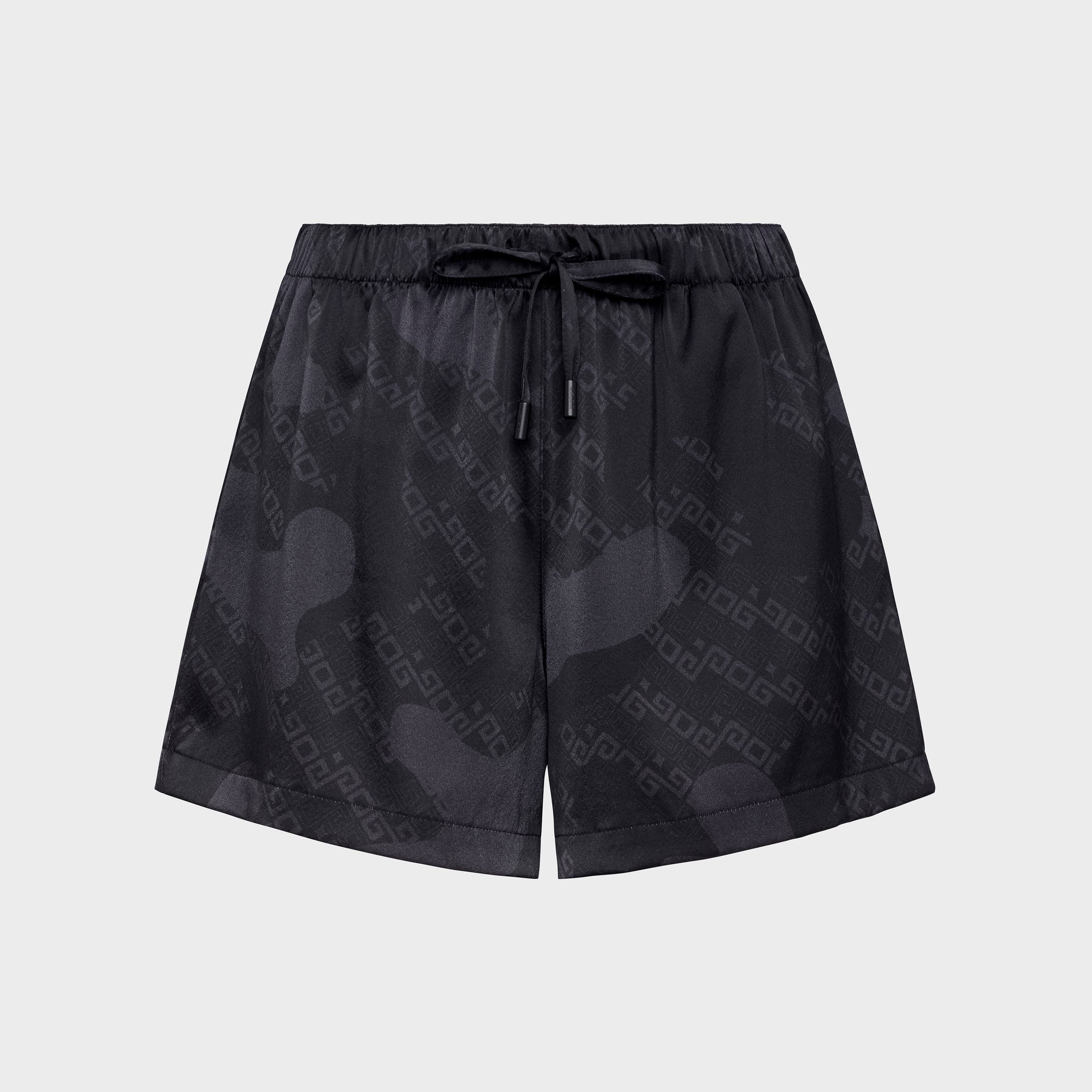 Effortlessly refined, these printed silk shorts echo the understated elegance of the matching shirt. Featuring soft tones of black, the lightweight silk drapes smoothly for a fluid, barely-there feel. The relaxed fit and elasticated waistband offer ease and comfort, while the subtle incorporation of the brand’s signature within the print adds a discreet, luxurious touch. Perfect for laid-back days or elevated loungewear looks.
