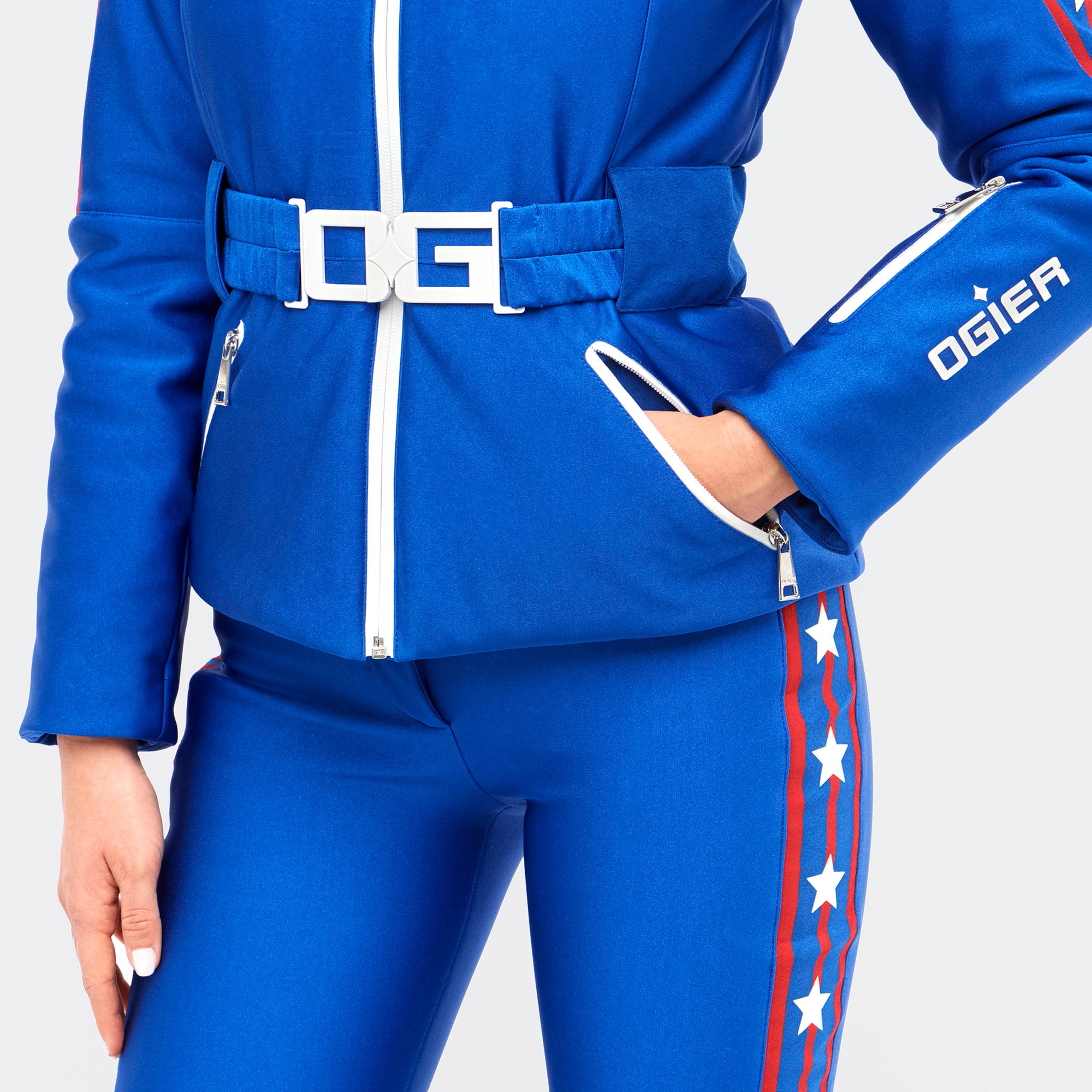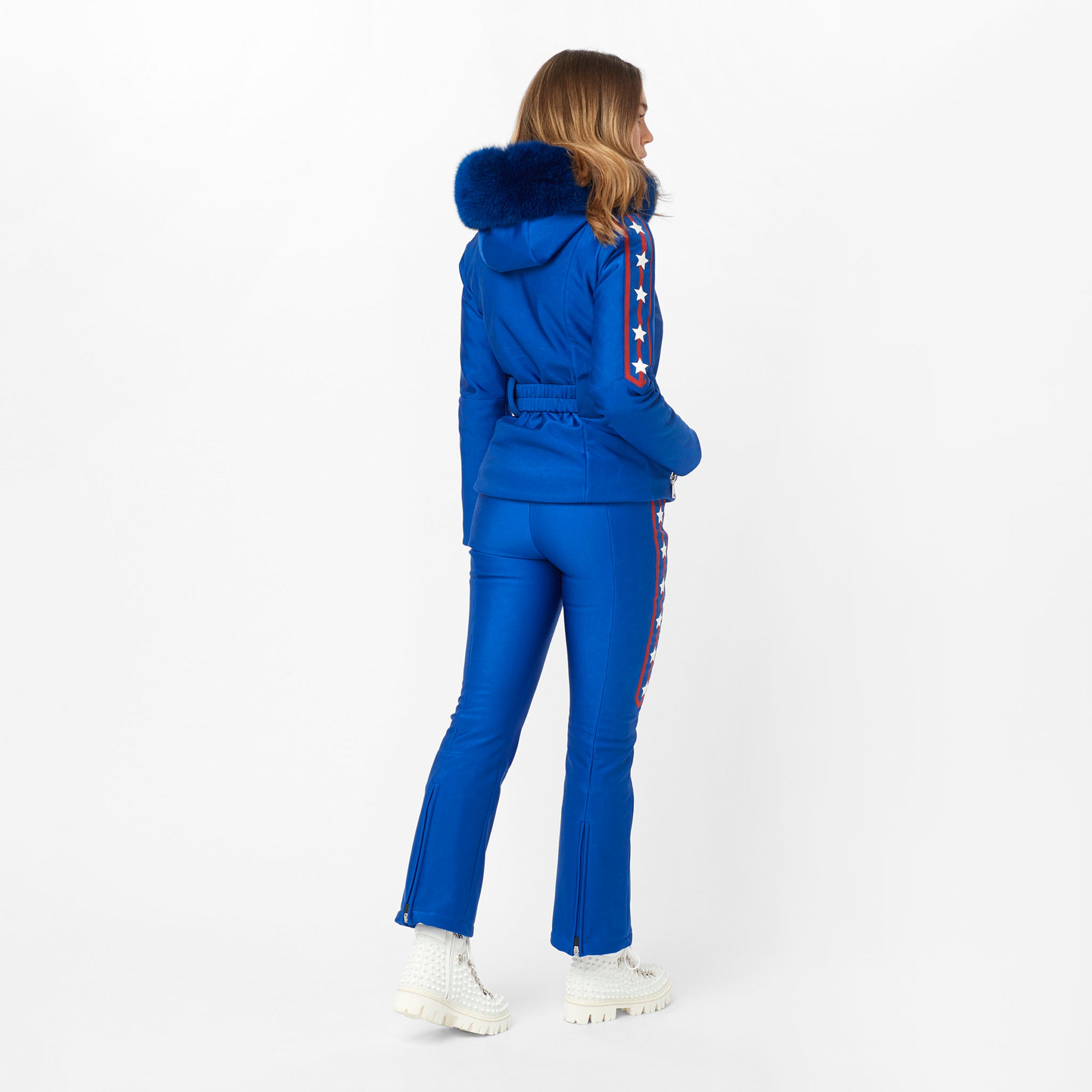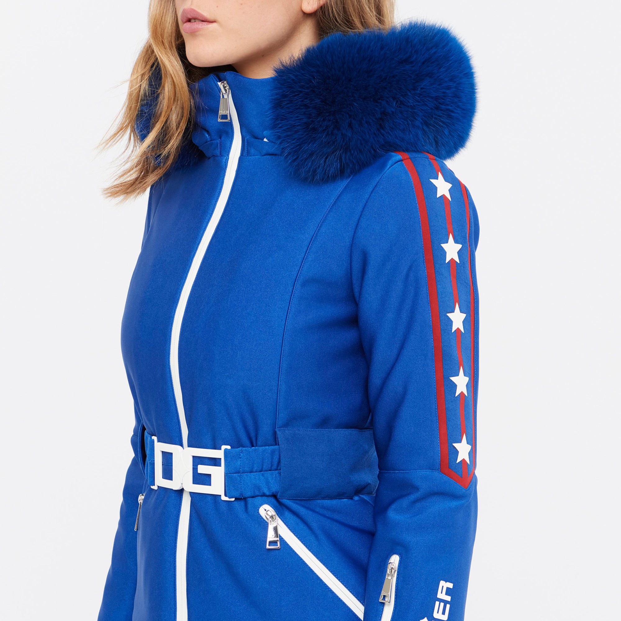 Notre silhouette Chamonix classique, avec une nouvelle matière technique brillante. Confectionnée dans une matière imperméable et entièrement respirante, elle assure une régulation précise de la chaleur et de l'humidité. Elle est dotée d'une capuche amovible et d'un col en fourrure, disponibles dans la couleur de votre choix. Présentée avec le pantalon de ski Vallorcine Star et les bottes de neige blanches à clous.