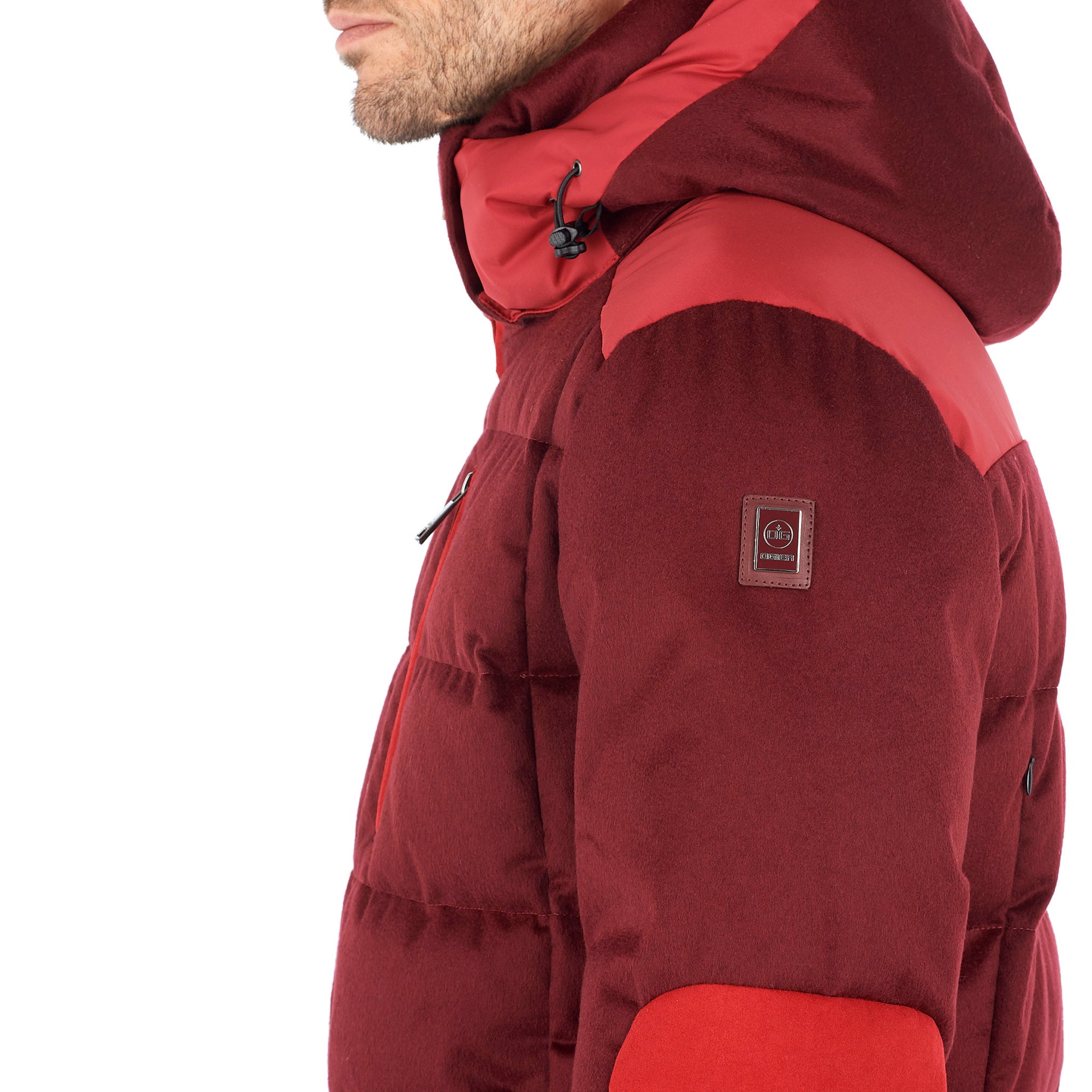 100% cashmere. 100% nylon lining, 100% down padding. Removable hood.