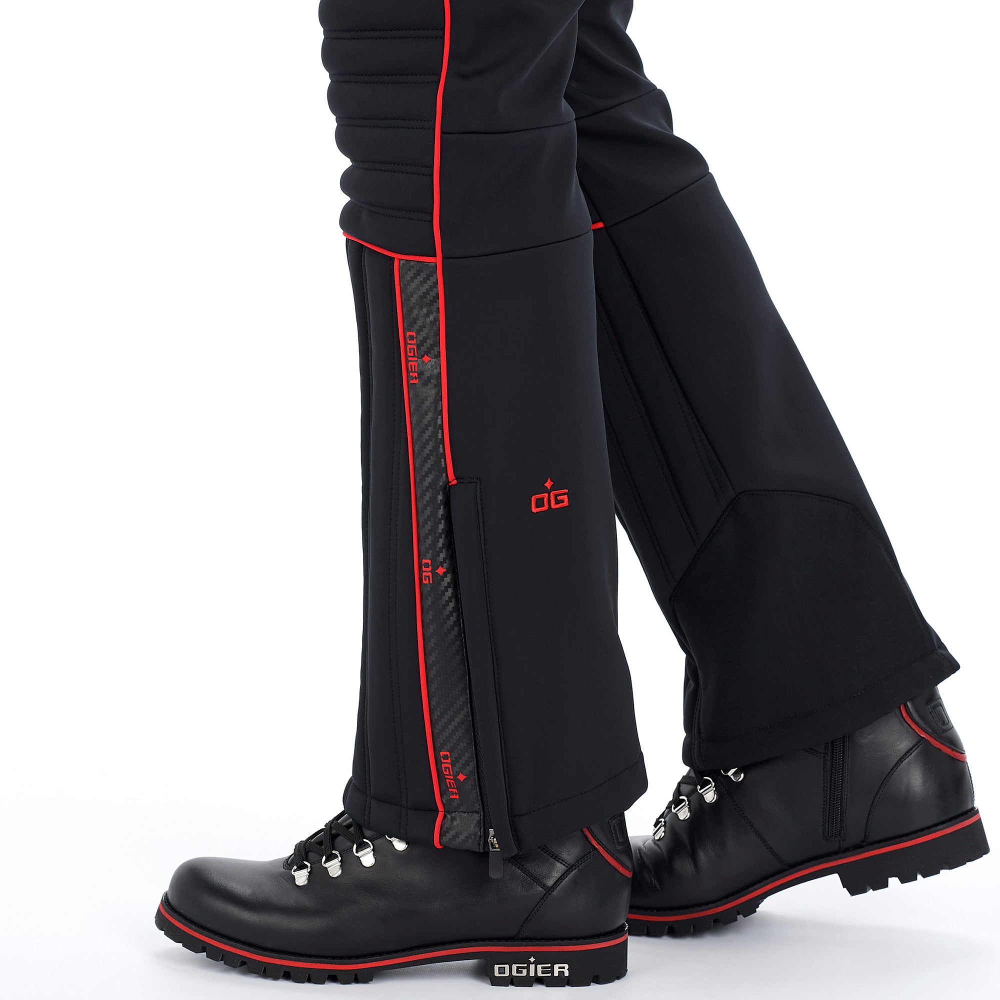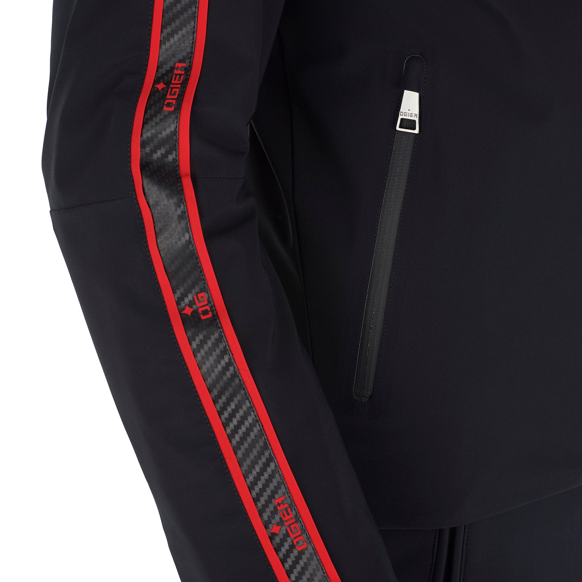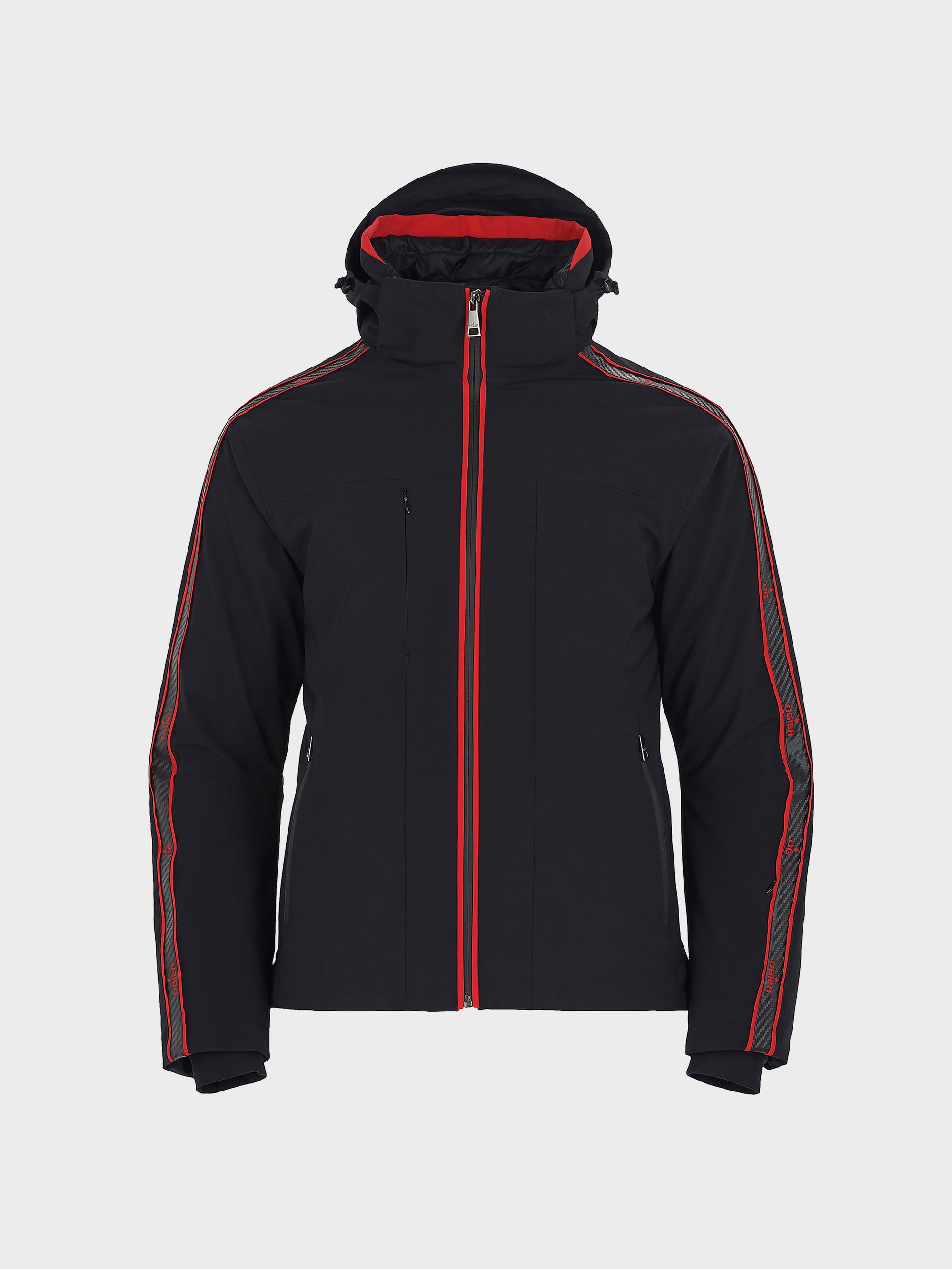 Fitted ski suit, stretch, light, warm and waterproof. The thin color bands giving elegance and structure, finishes of carbon fiber fabric.