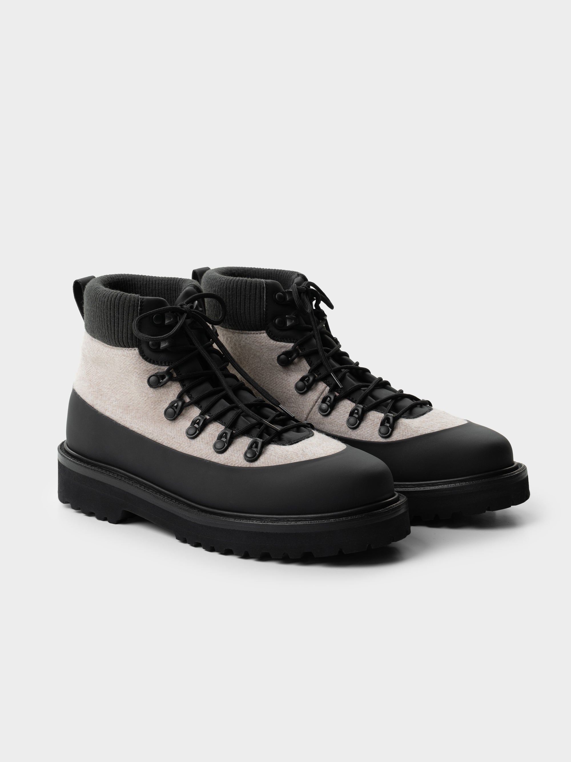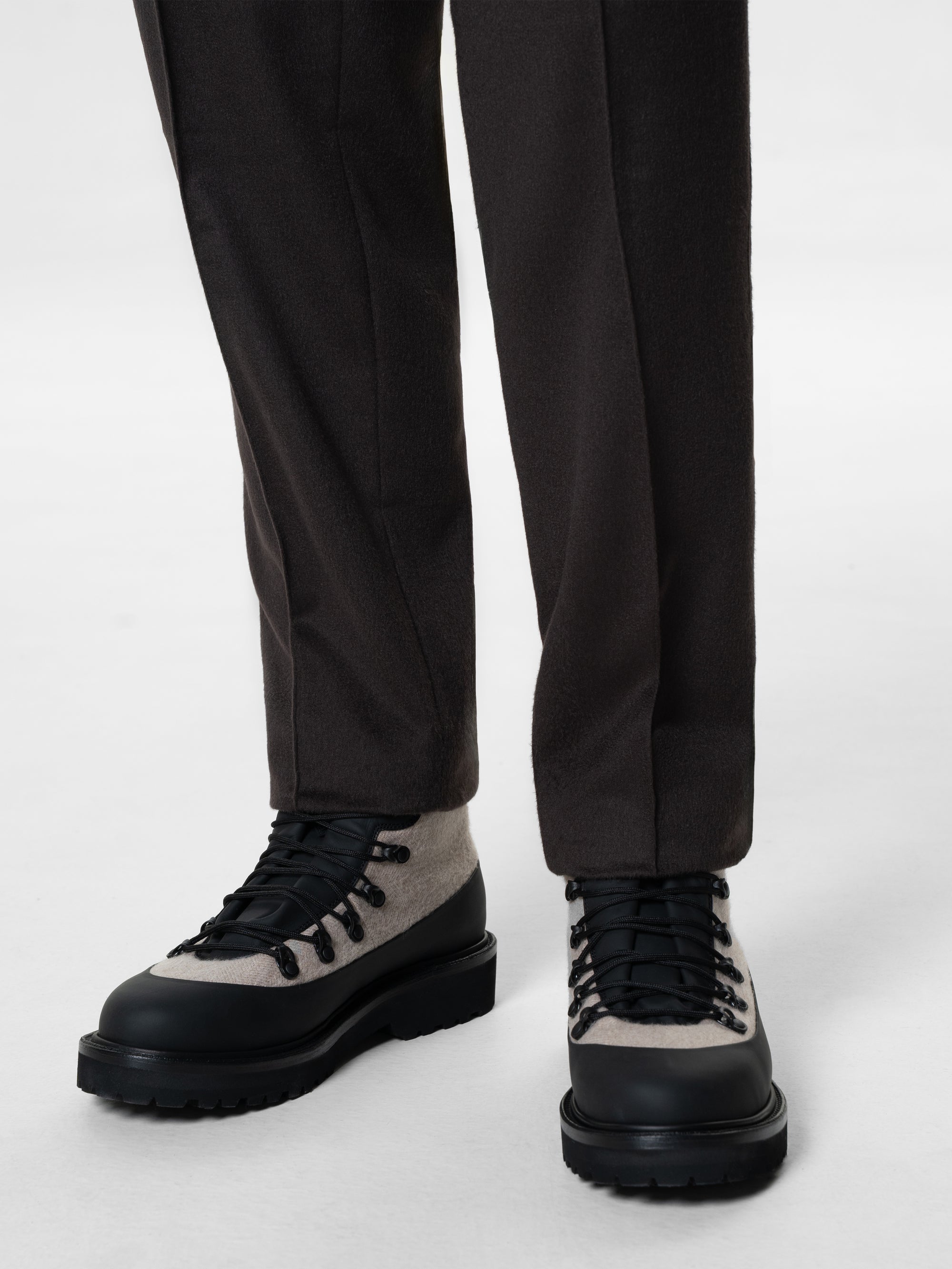 The perfect light weight après-ski footwear, these boots are crafted from French calfskin leather as well as waterproof silk wool blend. Designed for protection and comfort, they are lightweight yet durable, delivering exceptional support, flexibility, and grip on alpine terrain. Built to withstand harsh conditions, they provide unmatched performance and style for post-slope adventures.