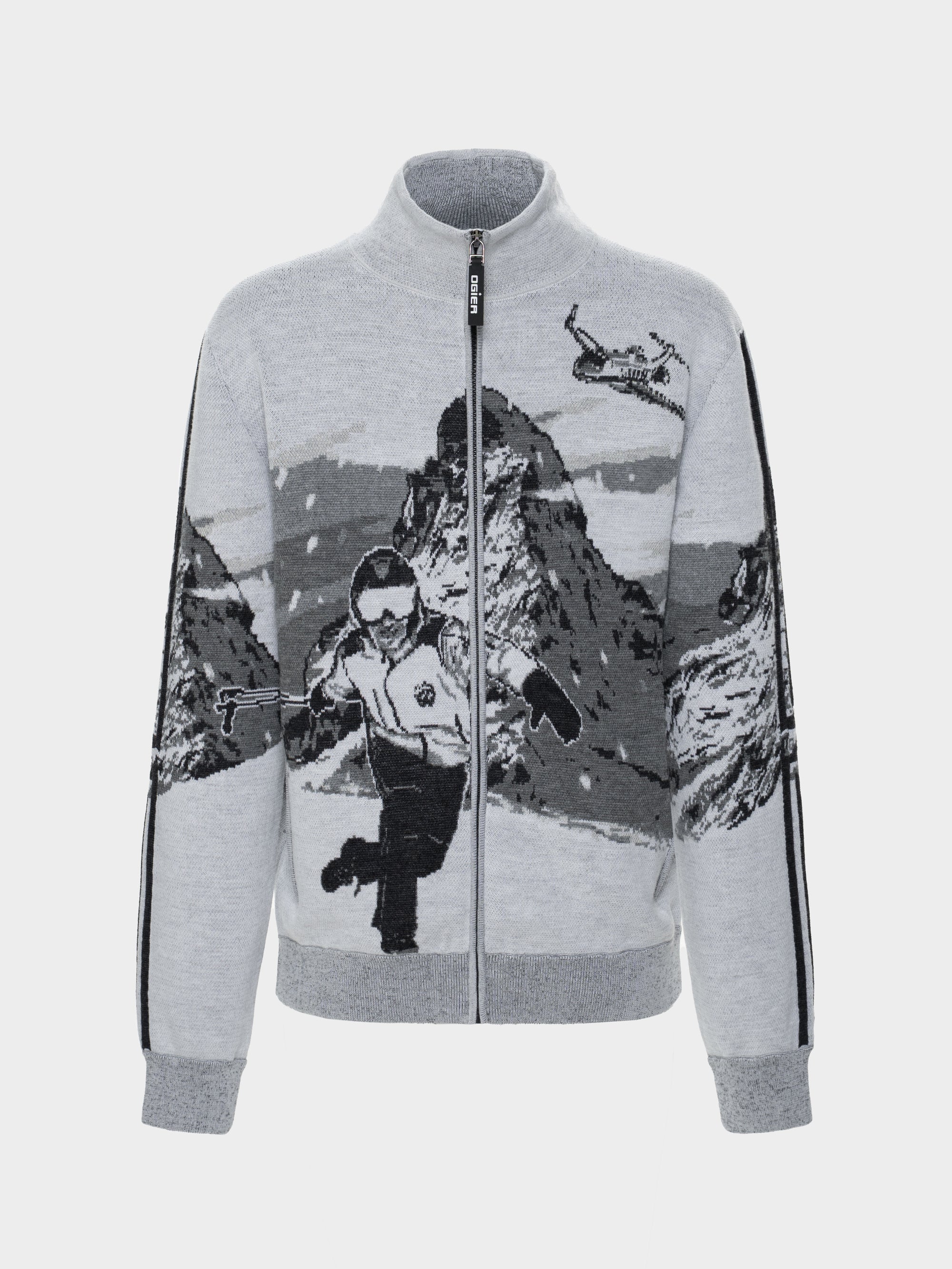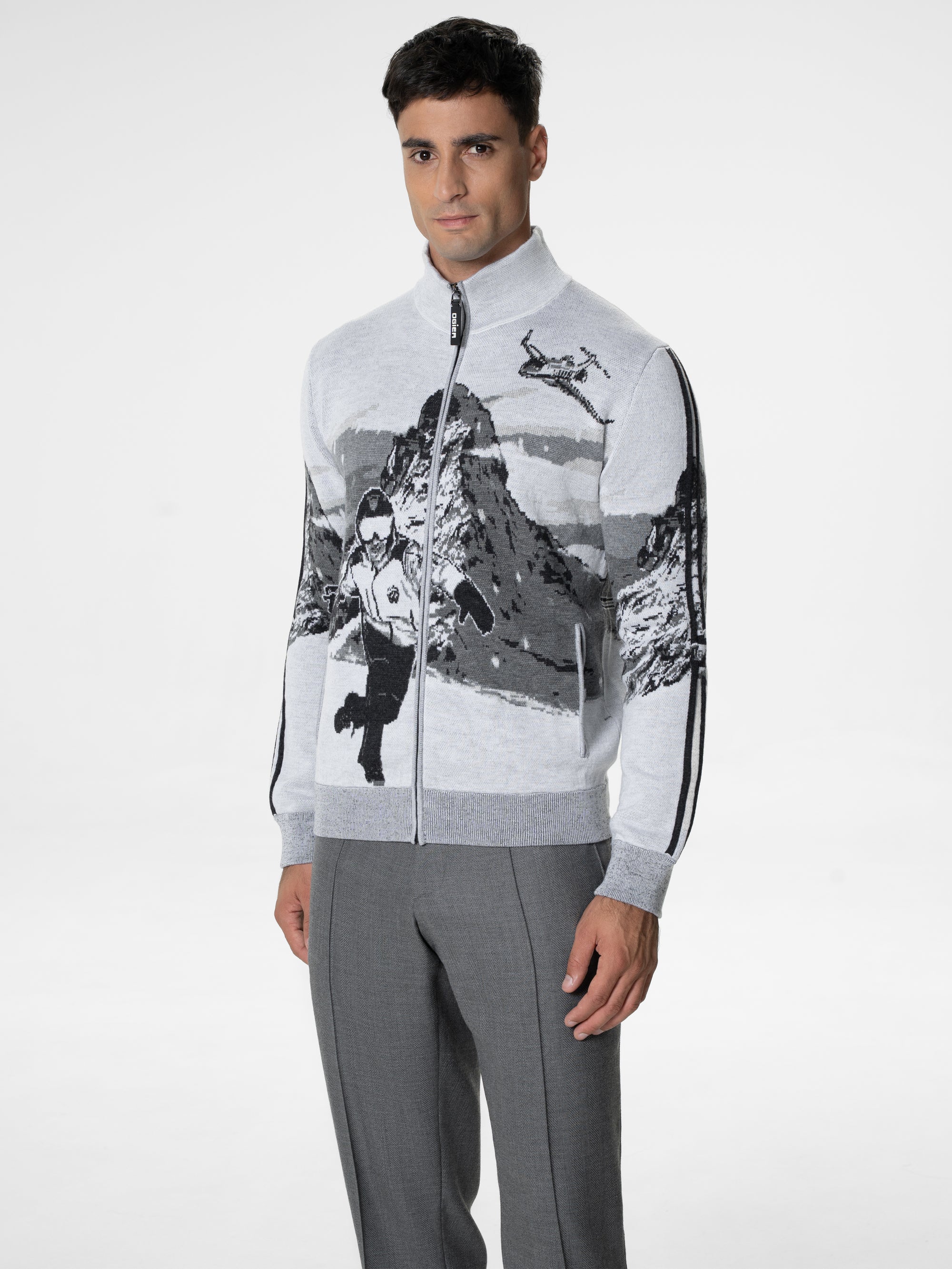 The Wayne sweater, crafted from a luxurious cashmere-wool blend, features a full zip for effortless versatility. Its playful design captures the spirit of Zermatt’s mountain charm, blending comfort, warmth, and contemporary alpine style.